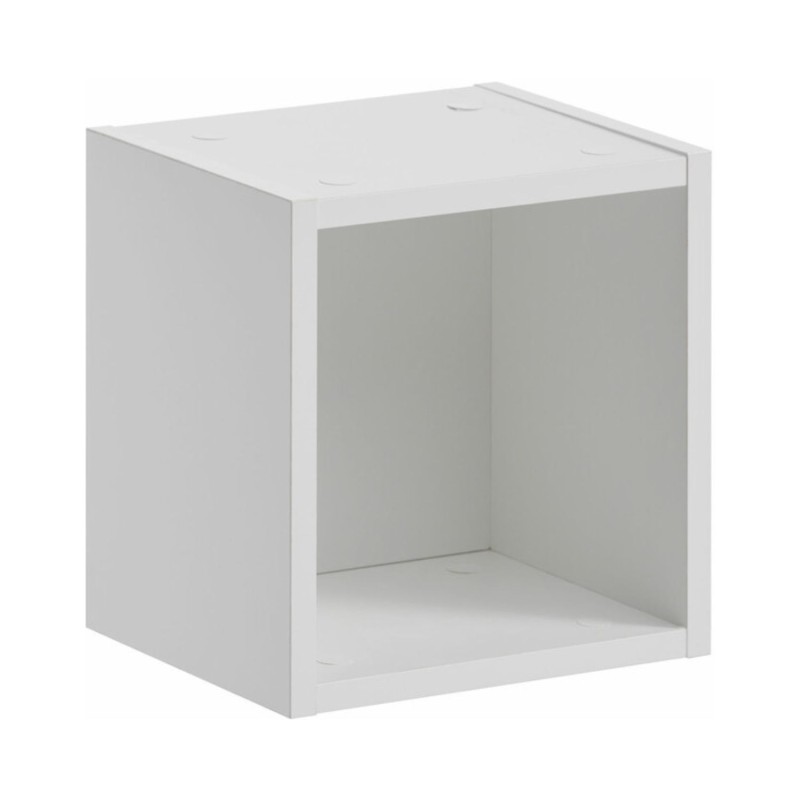 La composition est complétée par un cube de rangement également en blanc, intégré à la colonne, qui renforce le côté graphique du meuble tout en proposant un espace supplémentaire pour organiser vos accessoires du quotidien.