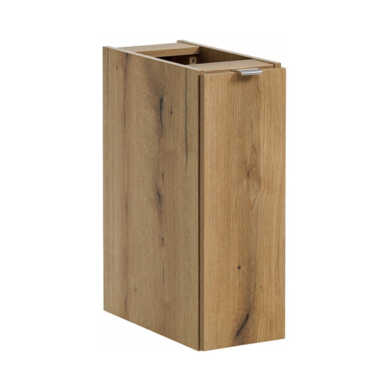 Les meubles sous vasque suspendus ainsi que la colonne de rangement se distinguent par leur aspect chêne foncé, créant une ambiance chaleureuse et naturelle. Ce coloris bois profond apporte du relief et s’intègre parfaitement dans une salle de bain contemporaine.