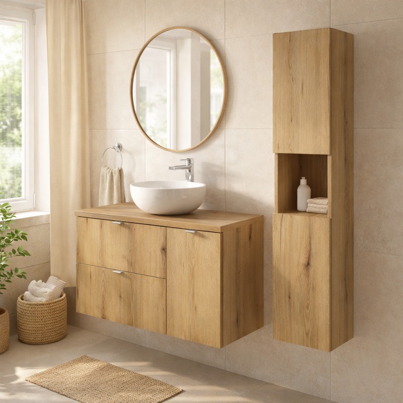La colonne de rangement, assortie en chêne foncé, vient compléter l’ensemble en offrant des espaces supplémentaires pour organiser vos produits et accessoires du quotidien.