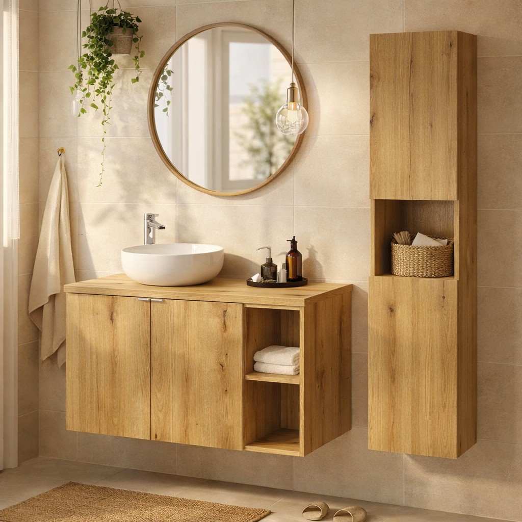 Grâce à sa pose suspendue, cet ensemble allège visuellement la pièce et facilite l’entretien du sol au quotidien.