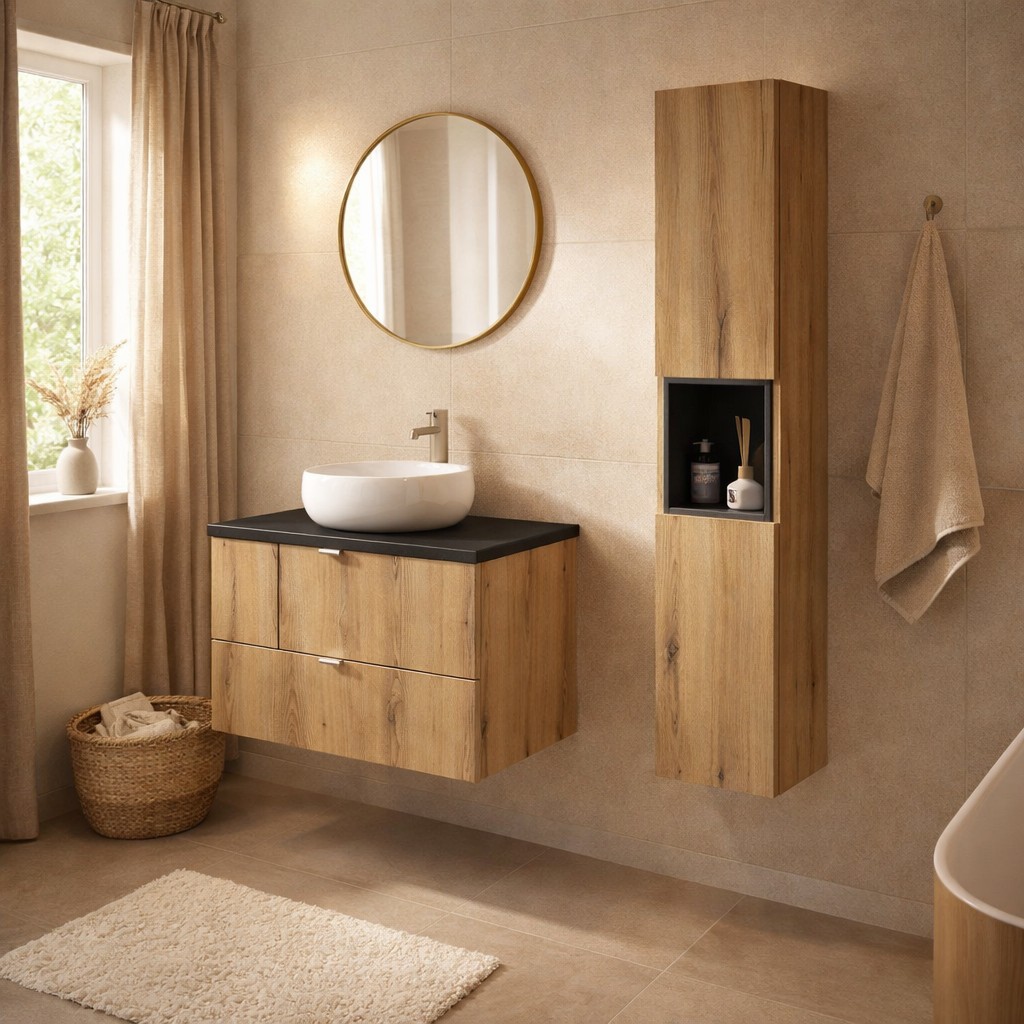 Le plan pour vasque noir vient créer un contraste élégant avec le meuble, renforçant le style contemporain de l’ensemble.