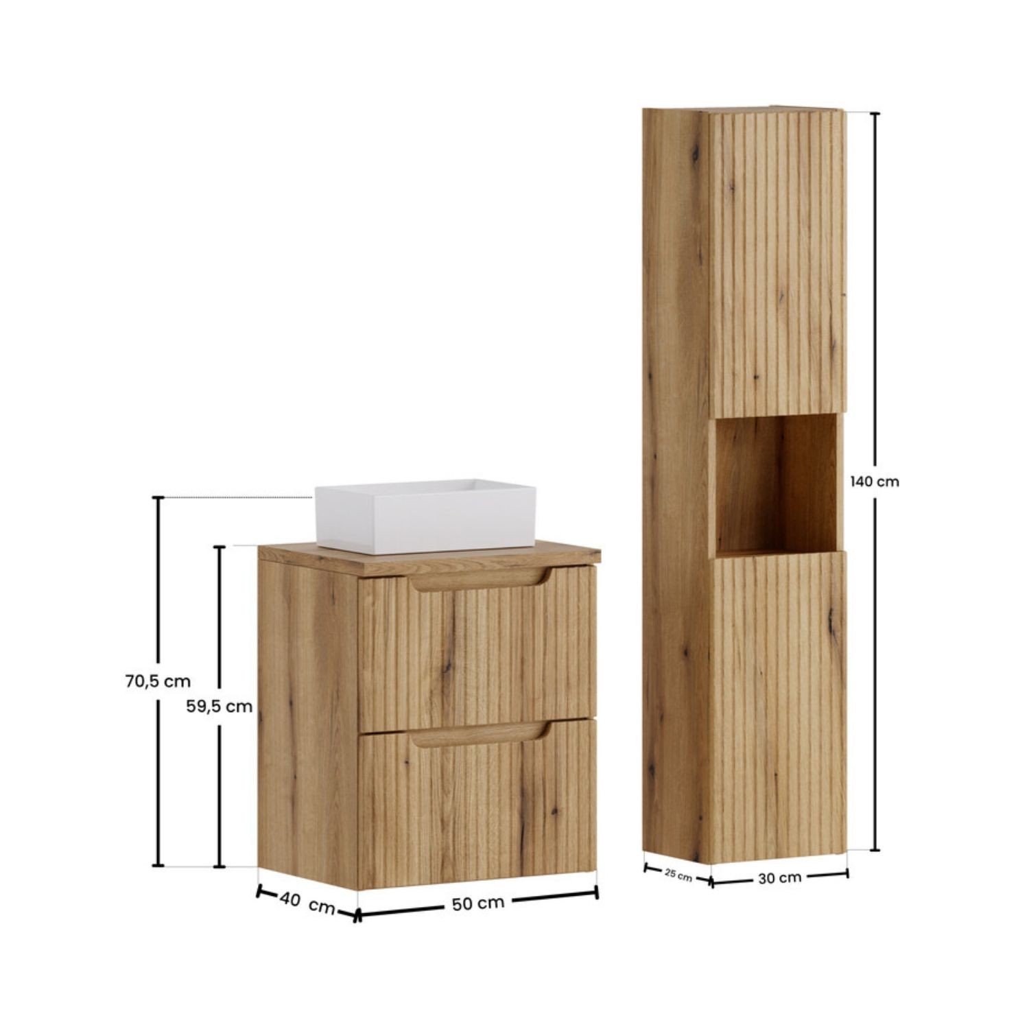 | Dimensions des éléments (en cm) | 1 meuble sous vasque 2 tiroirs : 50x57x39 + 1 plan pour vasque : 50,4x2,5x40 + 1 vasque à poser : 35x11x22 + 1 colonne : 30x140x25 |