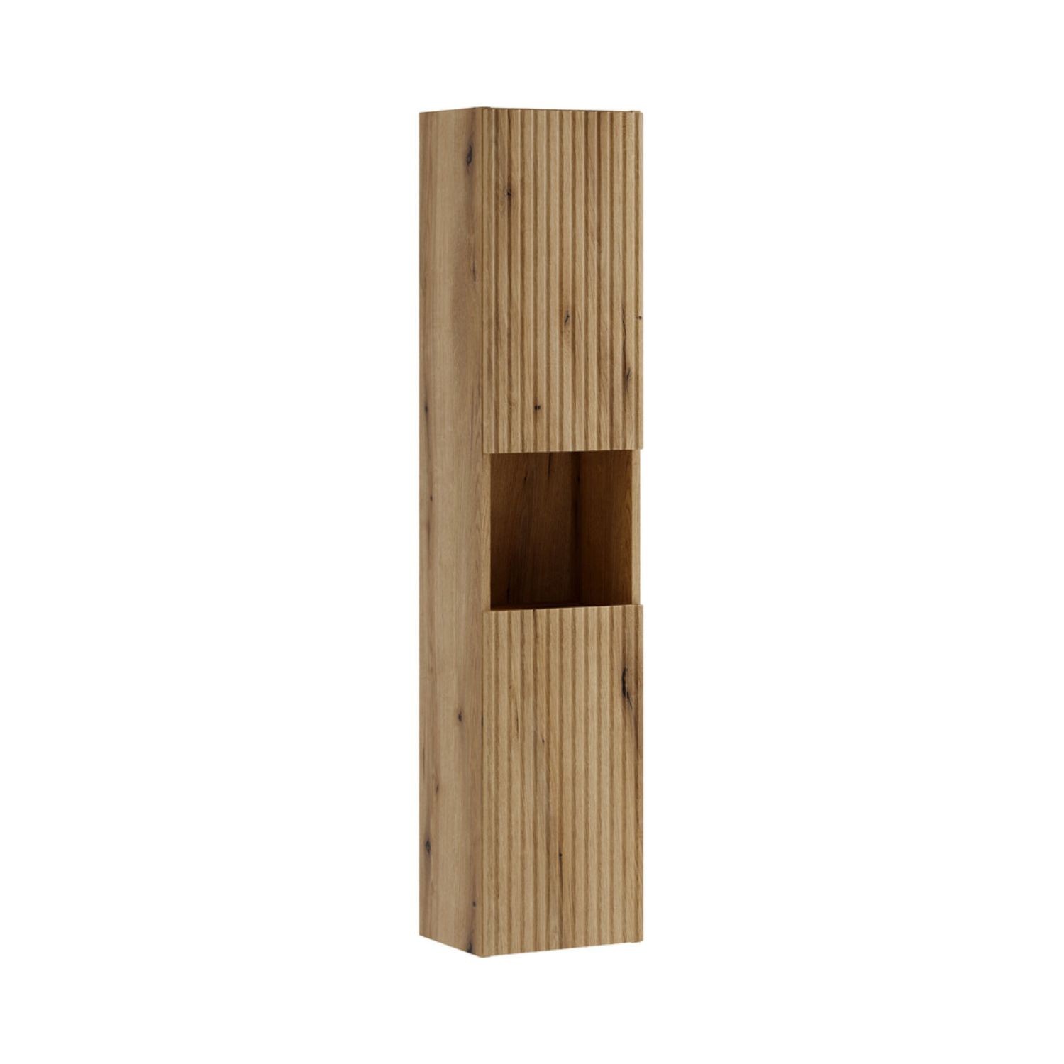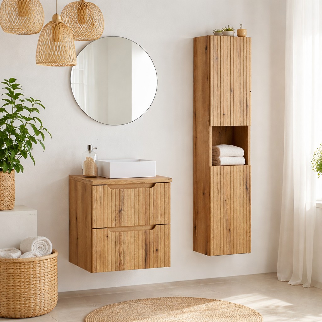 La colonne de rangement assortie en chêne clair complète cet ensemble en offrant des espaces supplémentaires pour une organisation optimale de votre salle de bain.