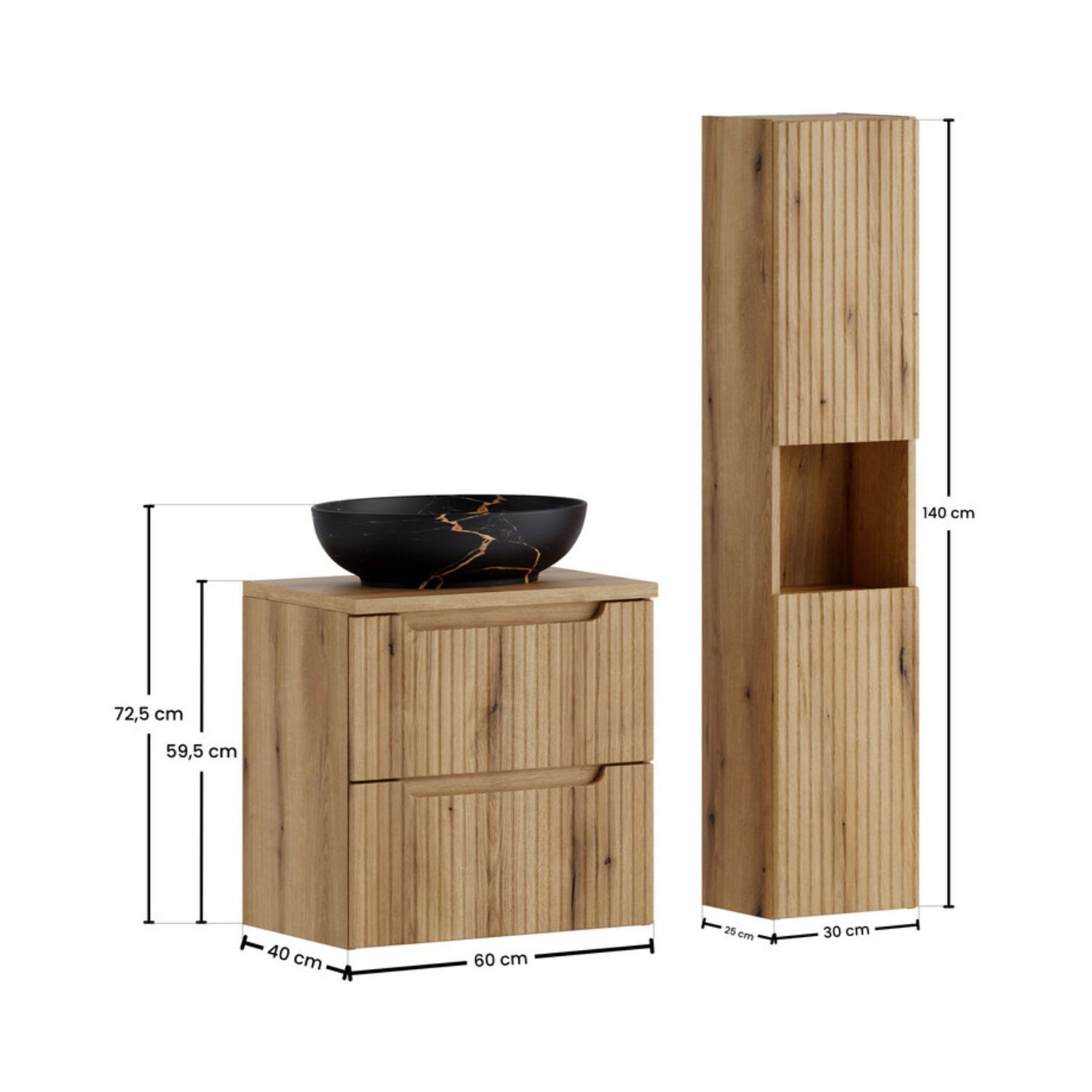 | Dimensions des éléments (en cm) | 1 meuble sous vasque 2 tiroirs : 60x57x39 + 1 plan pour vasque : 60,4x2,5x40 + 1 vasque à poser : 52x13x39,5 + 1 colonne : 30x140x25 |