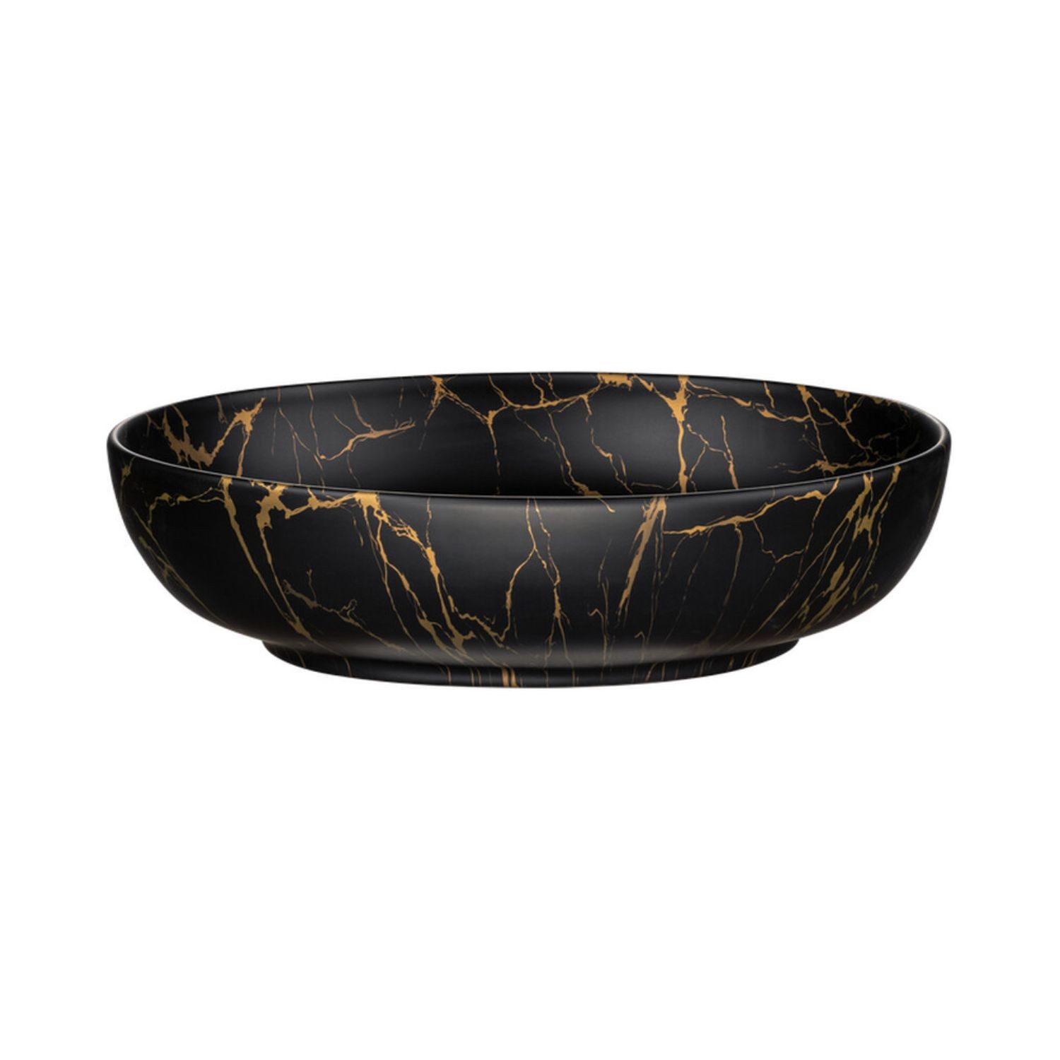 Le plan pour vasque accueille une superbe vasque à poser en céramique noire marbrée bronze, au design ovale raffiné, qui apporte une véritable signature esthétique à votre salle de bain.