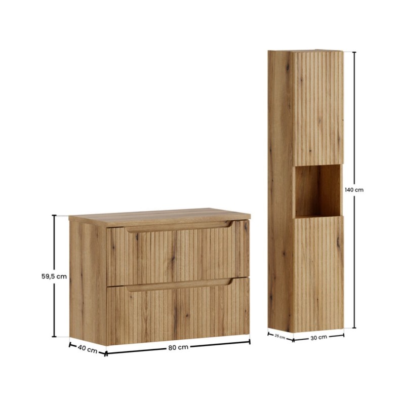 | Dimensions des éléments (en cm) | 1 meuble sous vasque 2 tiroirs : 80x57x39 + 1 plan pour vasque : 80,4x2,5x40 + 1 colonne : 30x140x25 |