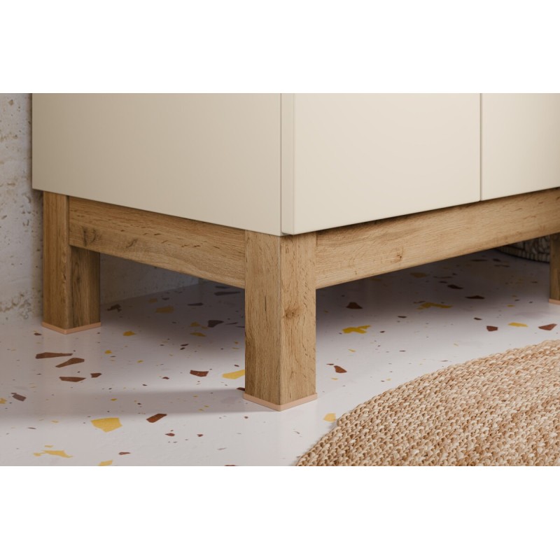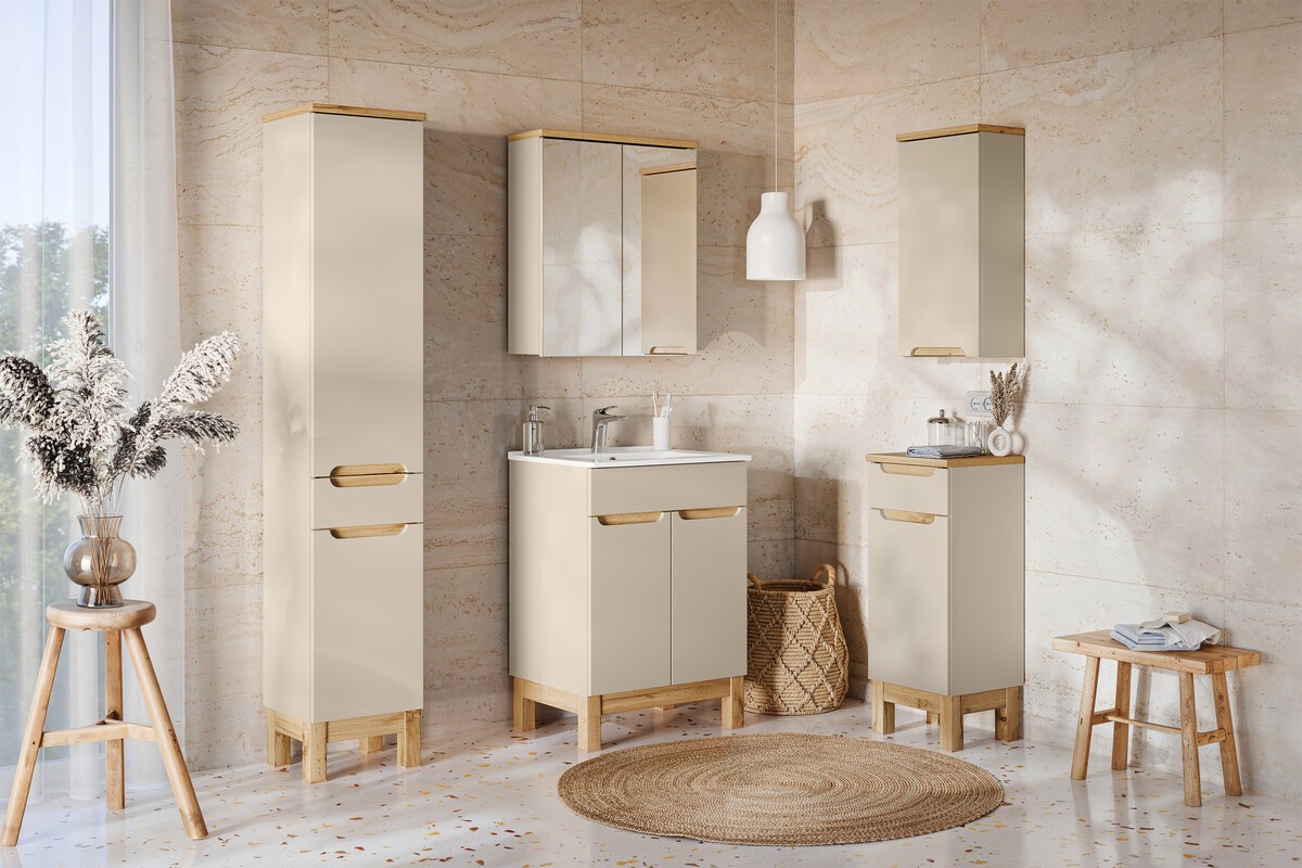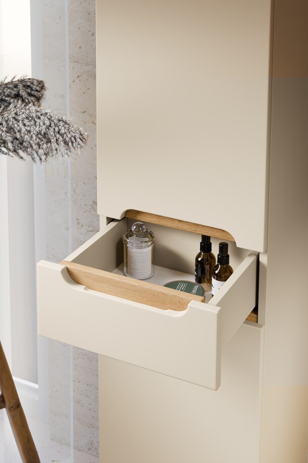 L’association du coloris cachemire et du chêne clair crée une ambiance chaleureuse, contemporaine et raffinée.