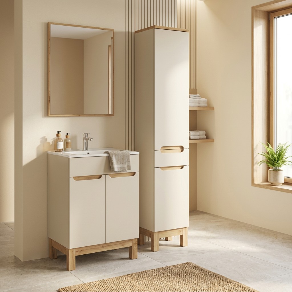 L’association du coloris cachemire et de l’aspect chêne clair crée une ambiance chaleureuse et apaisante, idéale pour une salle de bain contemporaine.