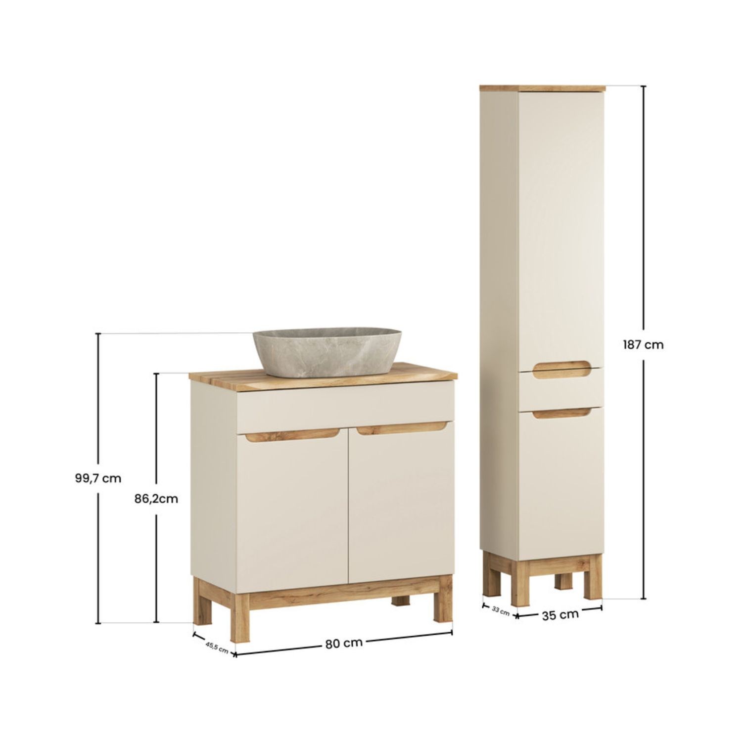 | Dimensions des éléments (en cm) | 1 meuble sous vasque 2 portes : 80x84x46 + 1 plan pour vasque biseauté : 80,6x2,2x47,5 + 1 vasque à poser : 50,5x13,5x38,5 + 1 colonne : 35x187x33 |