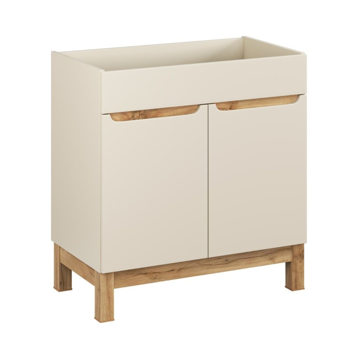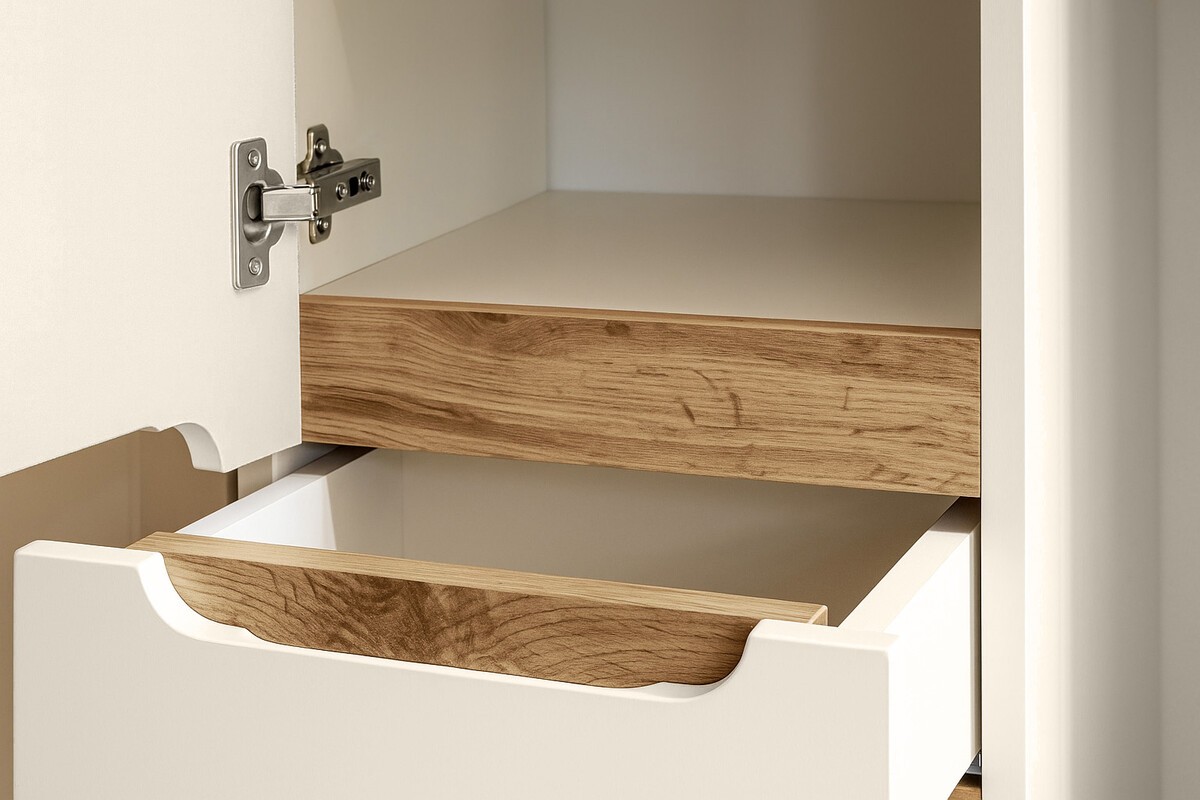 Son association de coloris cachemire et aspect chêne clair crée une atmosphère chaleureuse et apaisante, parfaite pour un espace bien-être moderne.