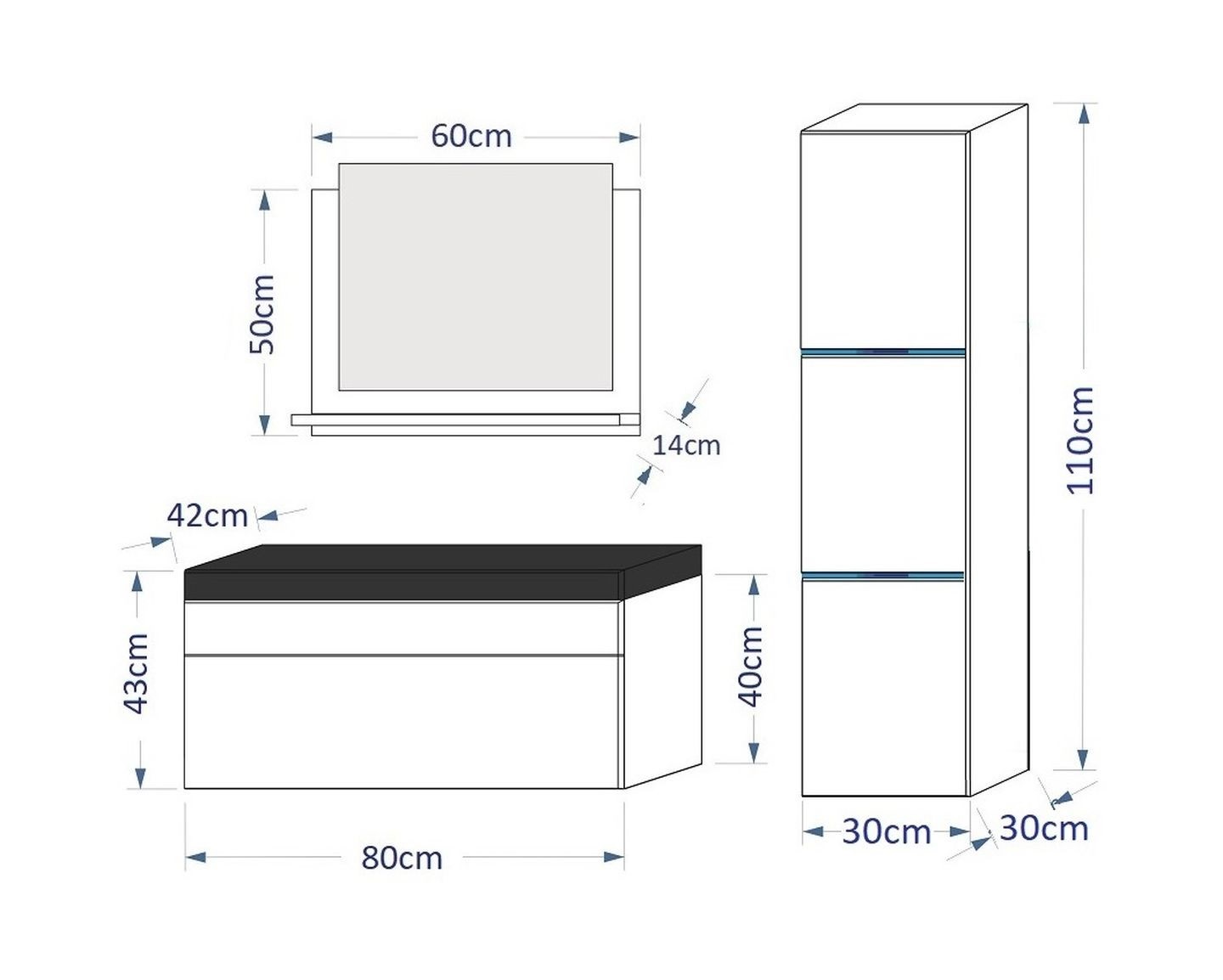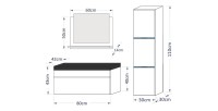 | Dimensions des éléments (en cm) | - Dimensions Meuble sous vasque : 80x43x42cm - Dimensions Colonne : 30x110x30cm - Dimensions Miroir : 60x50x14cm - Dimensions Vasque : 80x10x43cm (pour les dimensions extérieures), vasque d'une profondeur de 8.5cm. |
