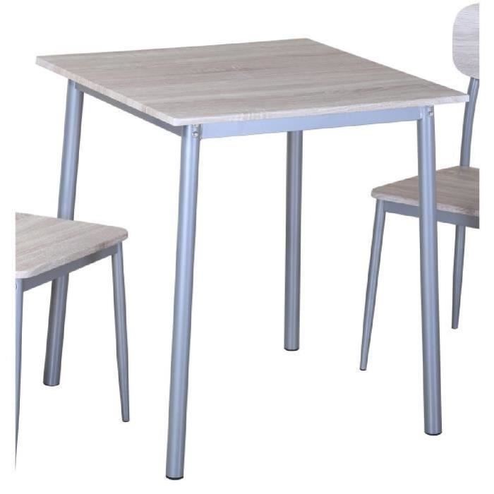 La table de cet ensemble est d'une structure carrée avec des dimensions de 70x76x70. Profitez de sa couleur chêne gris qui lui donne un air intemporel et son aspect robuste assuré par la structure en métal.