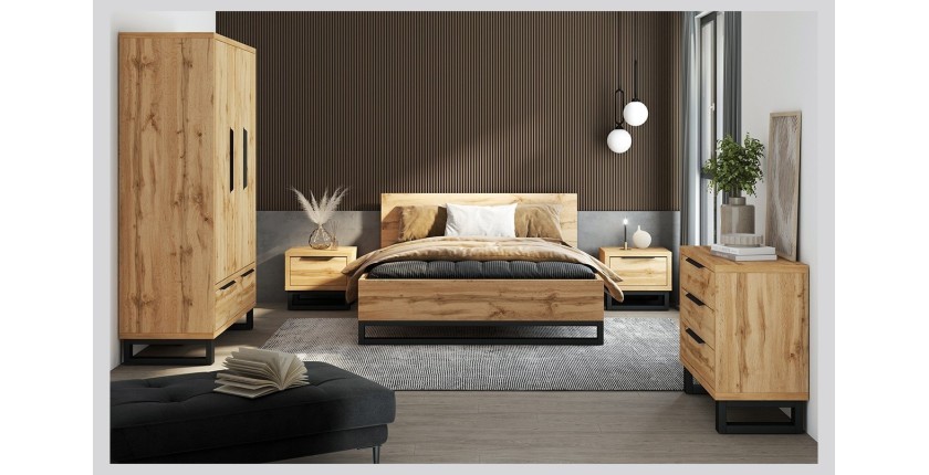 L'ensemble lit et chevets de la MILOS en couchage 160x200 est l'élément incontournable pour une chambre à coucher moderne et élégante. Avec son coloris chêne brut et ses pieds design noir, il apporte une touche de sophistication à votre pièce.