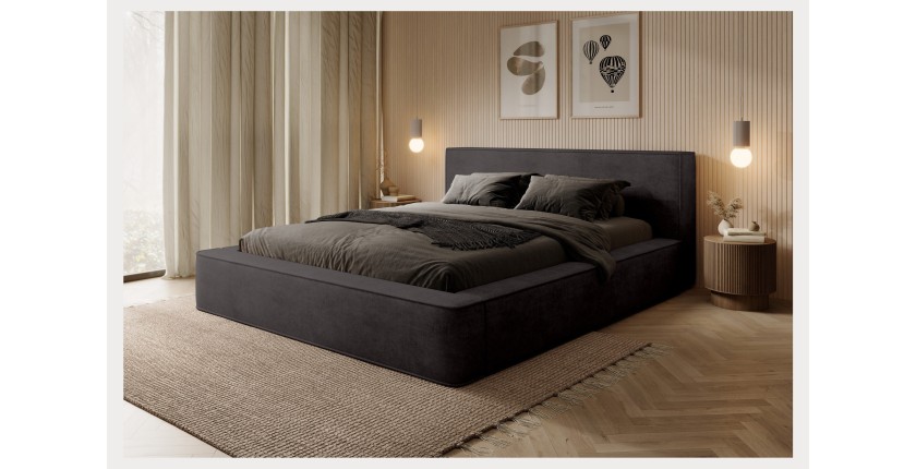 Le lit coffre VELORA 160x200 cm en tissu velours doux coloris gris anthracite est le choix idéal pour ceux qui souhaitent combiner style contemporain et rangement intelligent. Sa teinte sobre et chic, son grand coffre intégré et sa structure robuste en font un incontournable des chambres modernes.