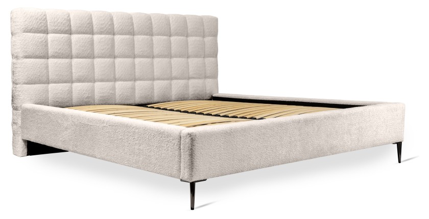 Sa tête de lit capitonnée de 112 cm, avec ses carrés graphiques, donne un style affirmé à votre intérieur. Le sommier à lattes inclus permet un confort immédiat, tandis que la structure en bois massif et panneaux de particules haute densité garantit solidité et durabilité. Les pieds noirs en métal de 15 cm assurent une finition moderne et une aération optimale du lit.