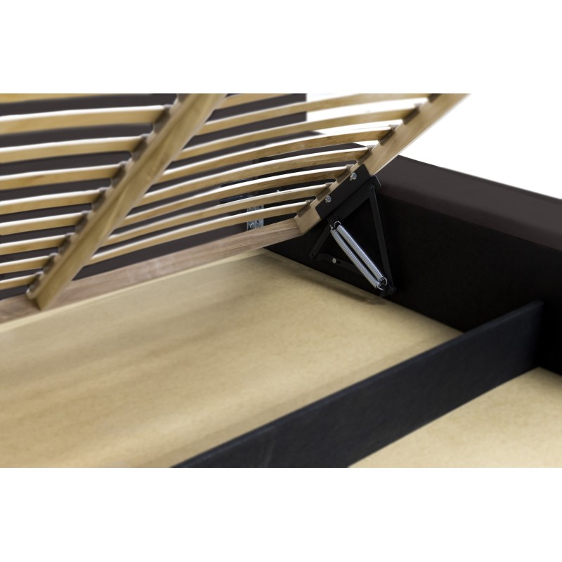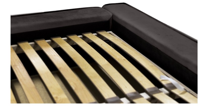 Sa tête de lit droite de 86 cm structure harmonieusement l’espace. Le sommier à lattes sur cadre métallique monté sur vérins à gaz permet une ouverture facile et silencieuse. Le coffre dissimulé sur toute la surface du lit est parfait pour organiser votre linge de lit. Sa structure robuste en bois, métal, mousse et panneaux de particules vous garantit un confort durable.