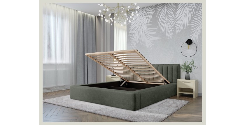 Ce lit coffre est équipé d’un sommier relevable à lattes en bois sur cadre métallique, avec vérins à gaz pour un accès facile et sécurisé à un coffre de rangement spacieux, idéal pour optimiser votre espace.