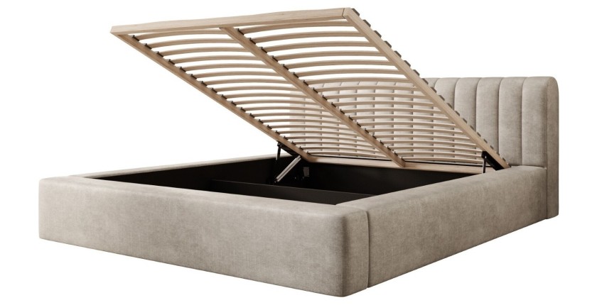 Ce lit coffre est équipé d’un sommier relevable à lattes en bois sur cadre métallique, avec vérins à gaz pour un accès simple et sécurisé à un coffre de rangement spacieux, parfait pour optimiser votre espace.