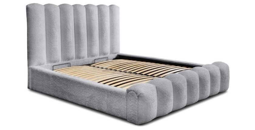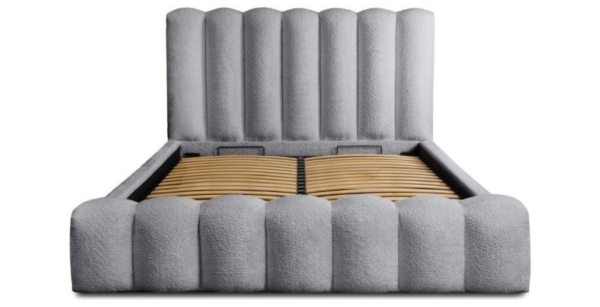 Avec des dimensions hors-tout de 240 x 175 x 120 cm, ce lit offre un couchage confortable et un espace de rangement pratique. Le tissu bouclé Perle d'aube apporte une touche élégante et lumineuse à votre chambre.