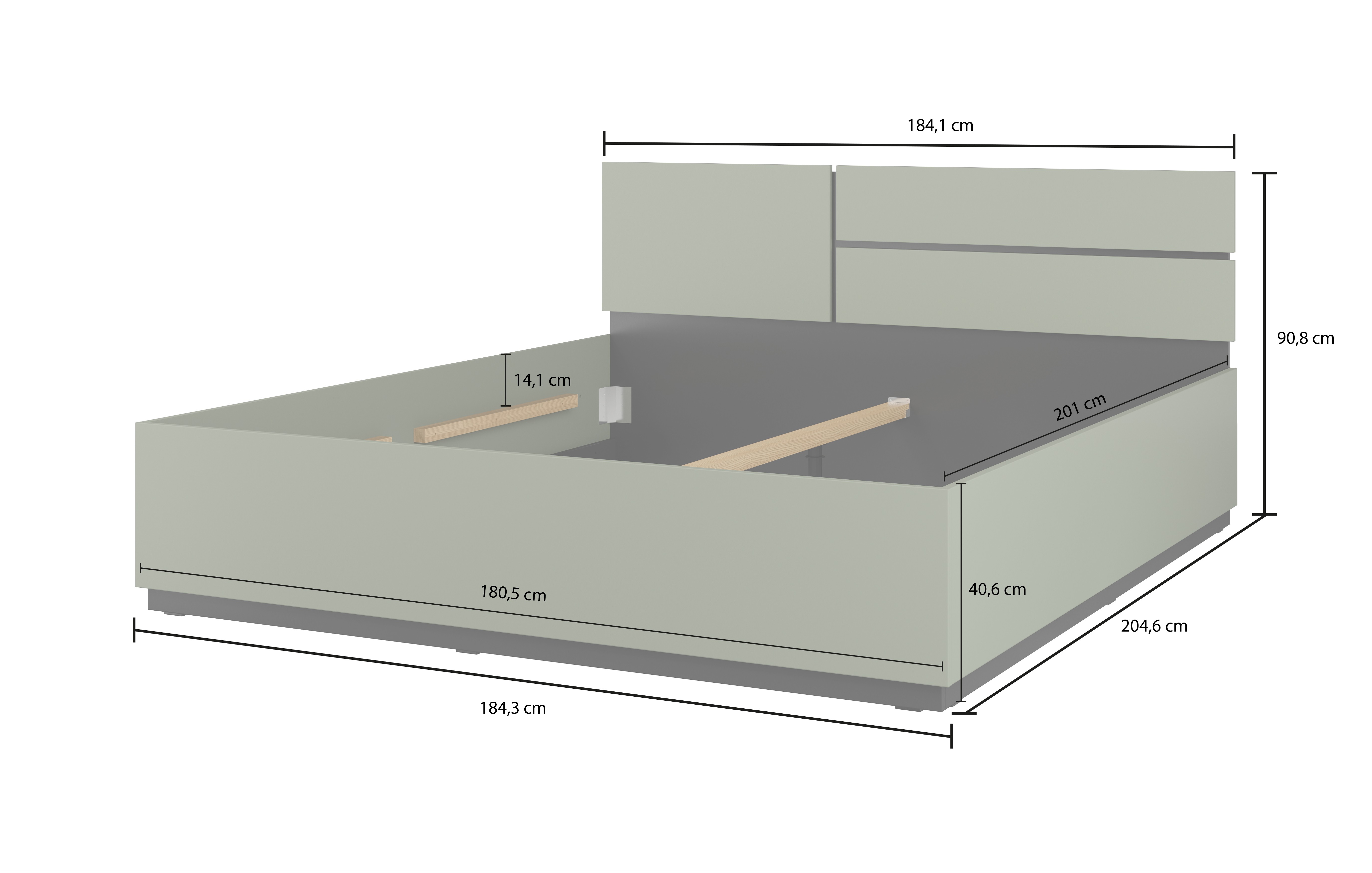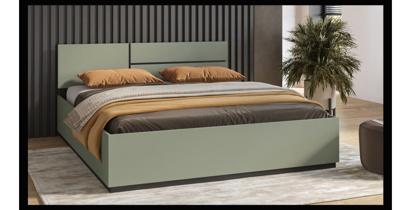 Conçu en panneaux de particules de haute qualité, ce lit robuste associe esthétique et solidité. Le contraste entre le vert sauge apaisant et les touches noires mates crée une ambiance naturelle et contemporaine. Sa tête de lit haute apporte du style tout en structurant l’espace. Le sommier inclus est relevable pour un accès facile au coffre de rangement, idéal pour stocker couettes, oreillers ou linge de lit.