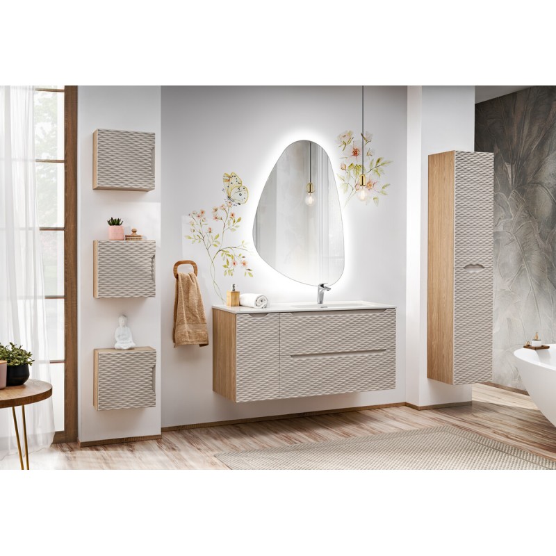 Le meuble de rangement YOKA 35 cm est la solution idéale pour les petits espaces. Sa conception murale, son design épuré et sa combinaison harmonieuse de beige mat et de chêne clair en font un élément aussi discret qu’esthétique dans votre salle de bain.