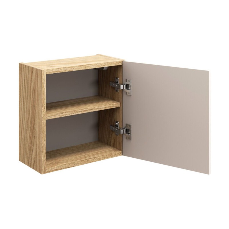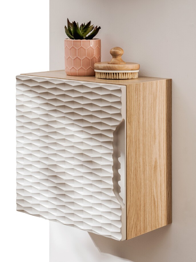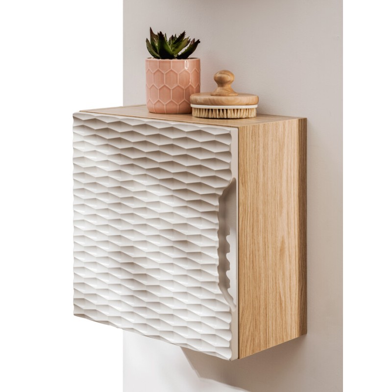Grâce à son format compact de 35 cm de largeur et de hauteur, le meuble YOKA s’intègre facilement au-dessus d’un plan vasque ou à côté d’un miroir. Il offre un rangement fermé avec une tablette intérieure pour garder vos produits de toilette à portée de main, tout en préservant l’ordre visuel de la pièce.
