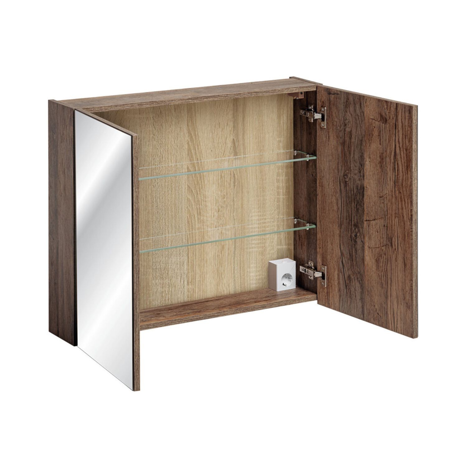 Ce meuble de rangement VANTA 80×65 cm chêne foncé apporte une touche naturelle et élégante à votre salle de bain grâce à sa finition aspect bois foncé. Parfait pour organiser vos produits du quotidien, il dispose de deux portes battantes avec miroirs et de deux tablettes intérieures permettant un rangement ordonné et discret.