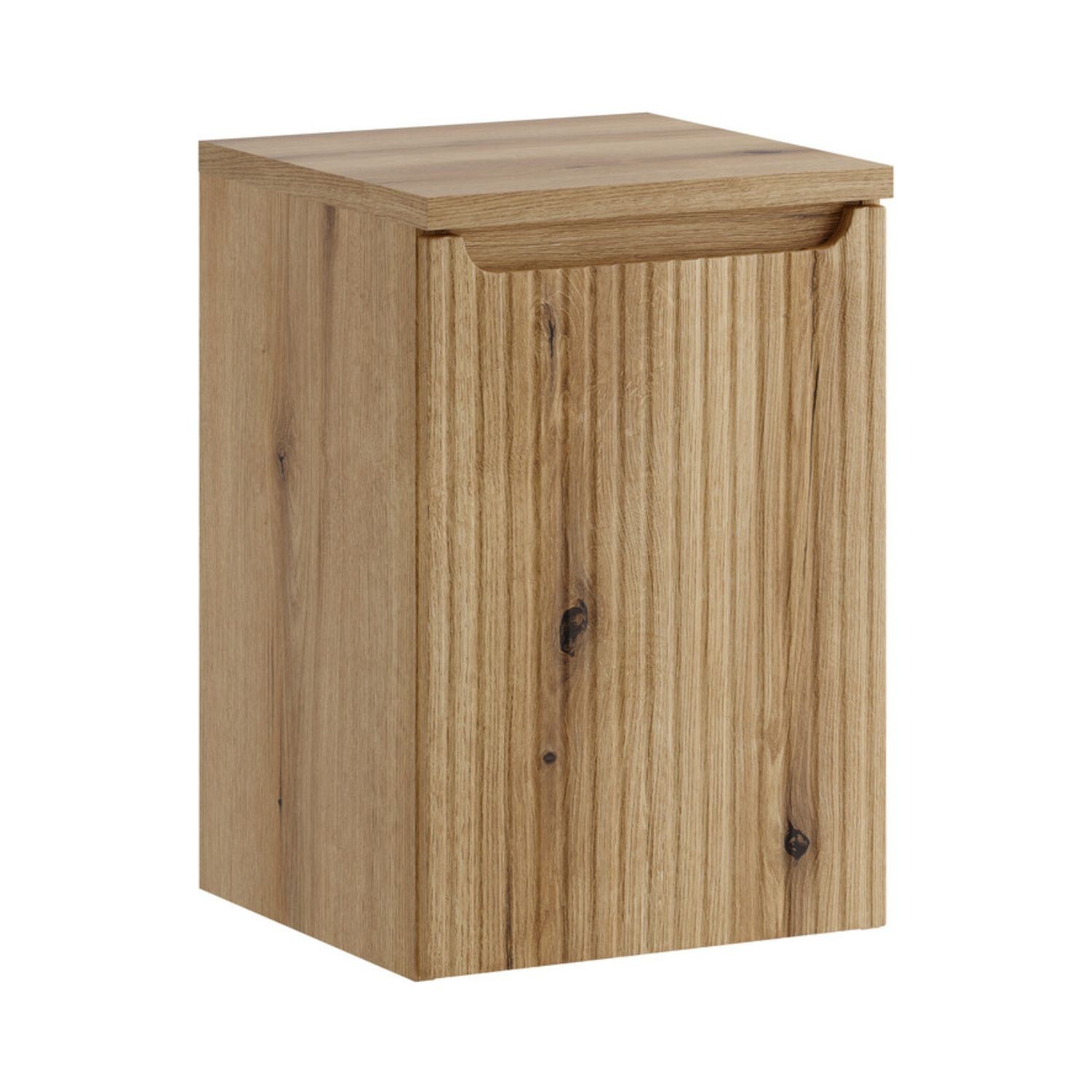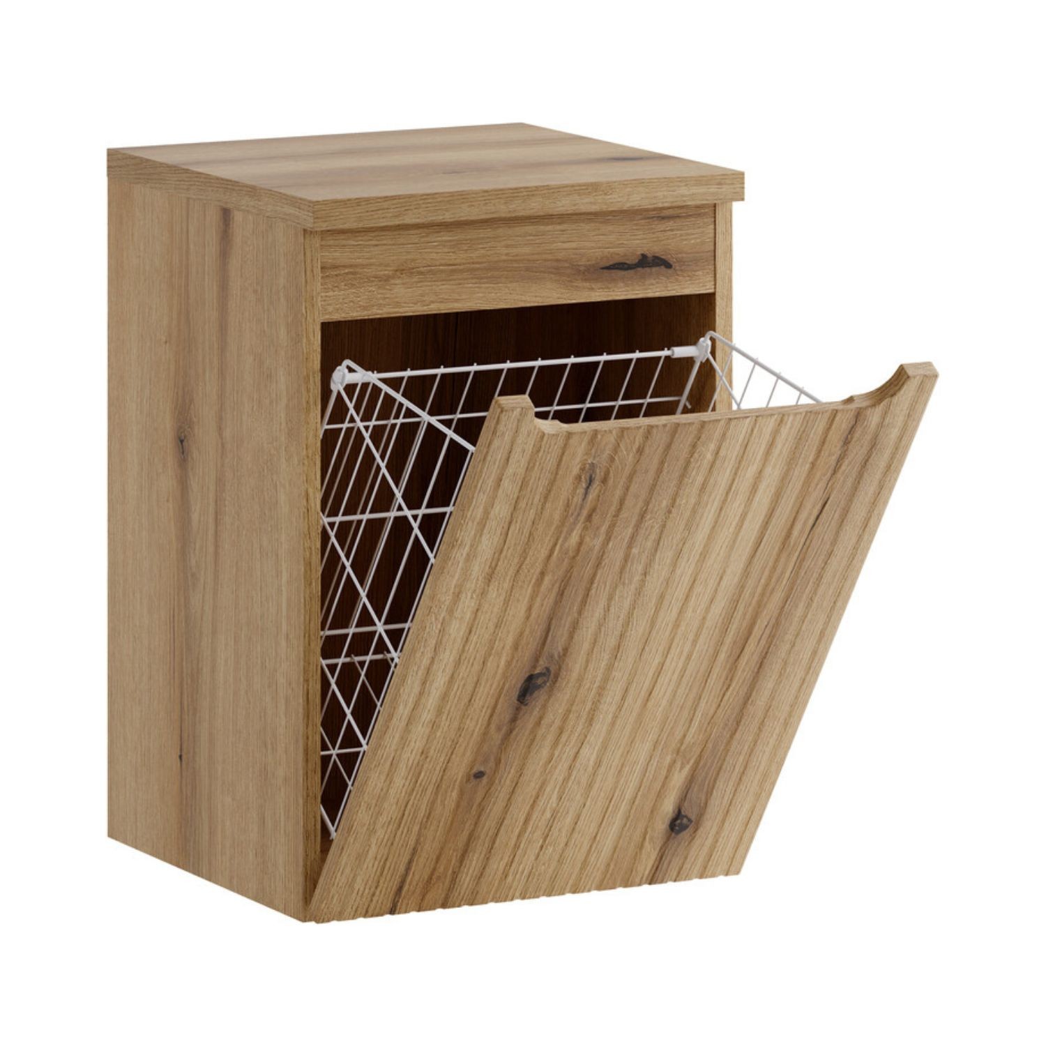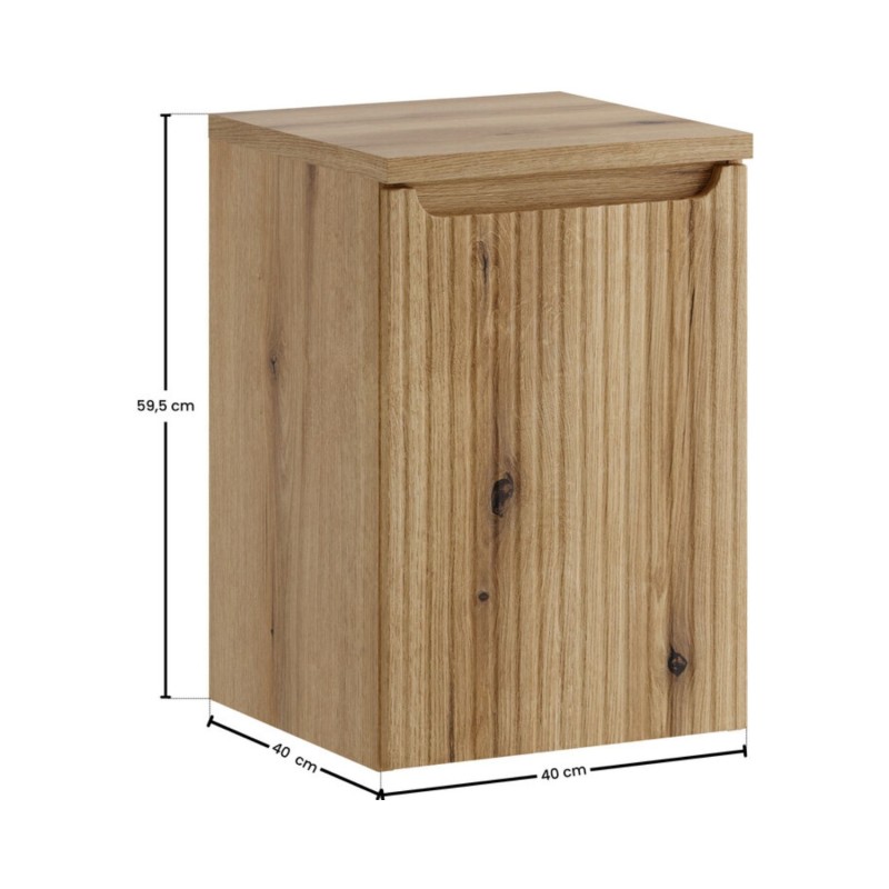 Doté d’une porte abattante en chêne clair avec façade rainurée verticalement, ce meuble permet de dissimuler votre linge tout en conservant un rendu esthétique moderne et structuré.