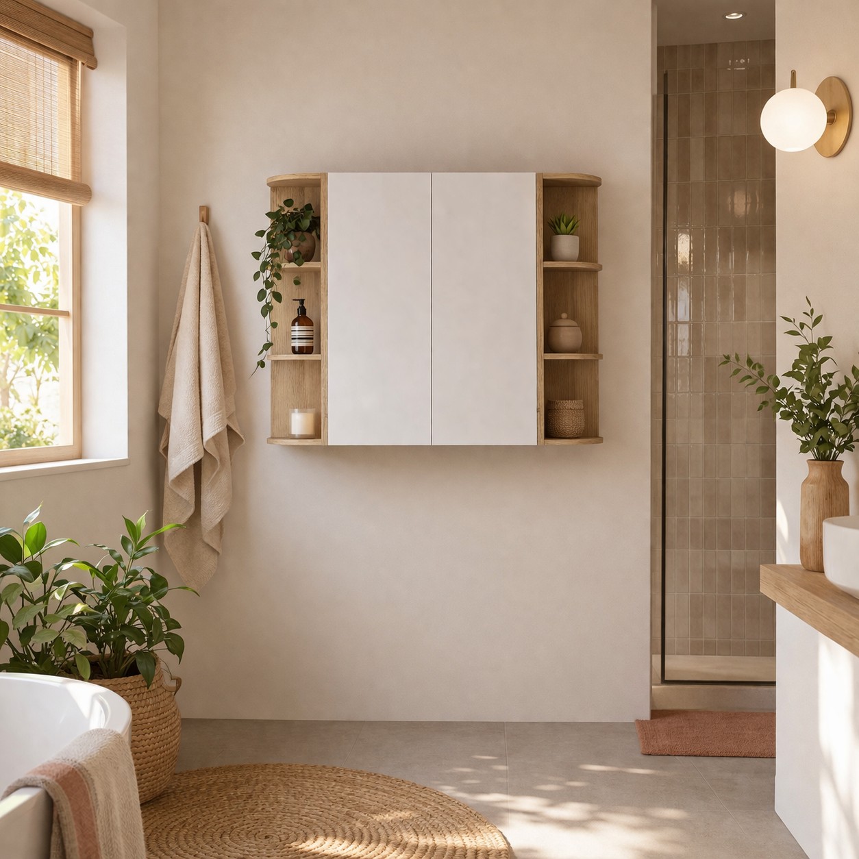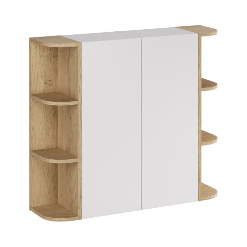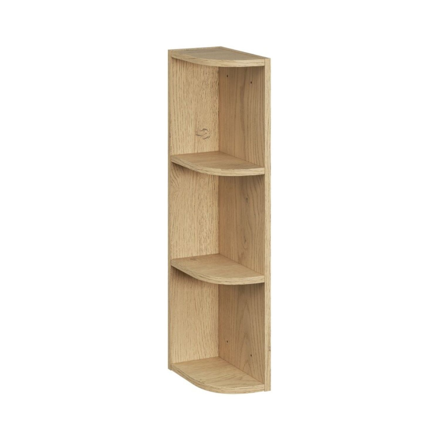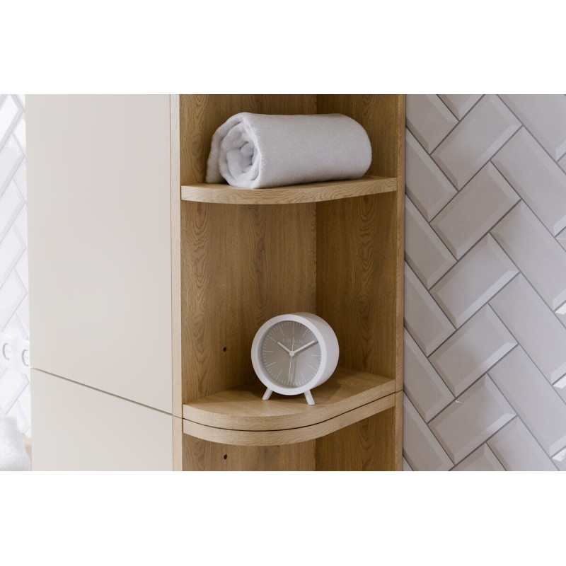 Les niches ouvertes avec plateaux arrondis en chêne clair apportent une touche douce et originale tout en mettant en valeur vos accessoires du quotidien.