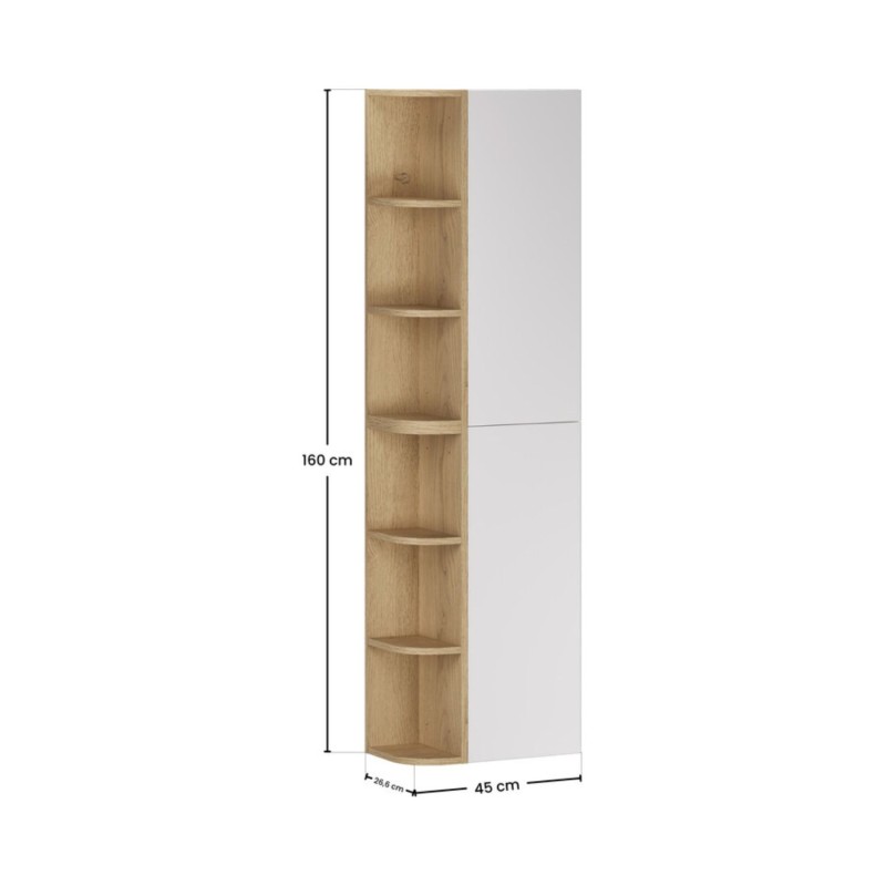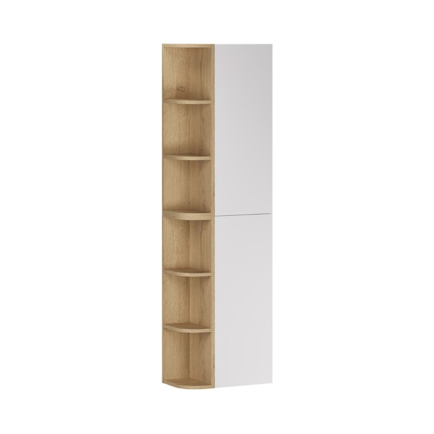 Cet ensemble comprend deux meubles avec porte en blanc mat et deux modules avec niches visibles arrondies en finition chêne clair, offrant un équilibre parfait entre rangement fermé et espaces ouverts décoratifs.