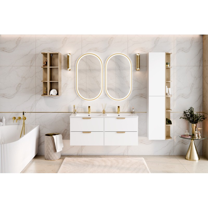 Apportez du caractère à votre salle de bain avec cet ensemble de meubles de rangement OSTER 45 cm, composé de modules suspendus au design contemporain associant un blanc mat élégant à des niches aspect chêne clair.