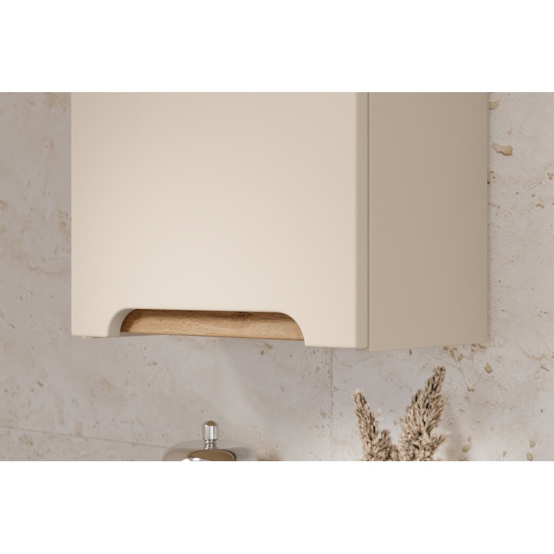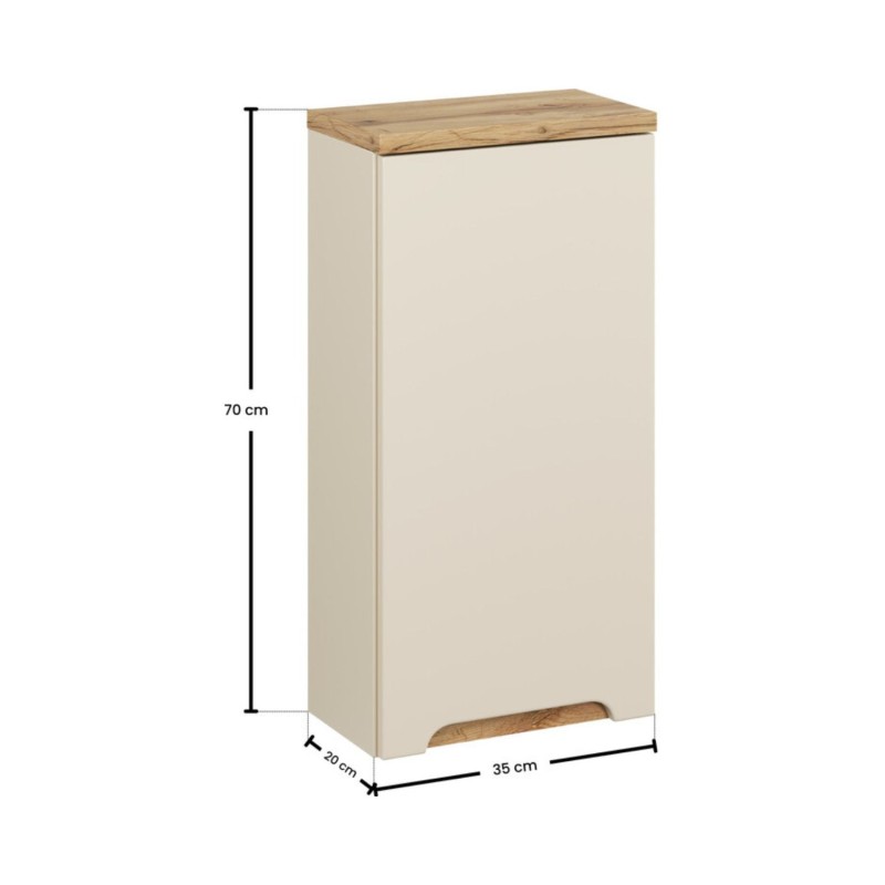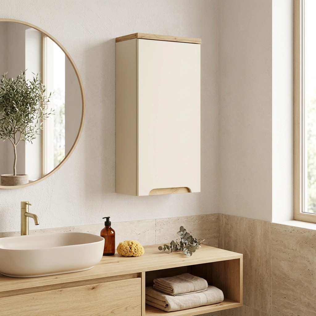 Apportez une touche de douceur et de modernité à votre intérieur avec ce meuble de rangement salle de bain ERMANO 35 cm, conçu dans un élégant coloris cachemire associé à des détails en chêne clair pour une ambiance chaleureuse et naturelle.