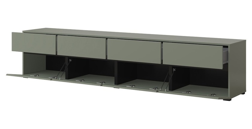 Apportez une touche contemporaine à votre salon avec le meuble TV XL HAVANA. Avec ses dimensions généreuses de 225 cm de largeur, 48 cm de hauteur et 40 cm de profondeur, ce meuble est doté de 4 portes abattantes et de 4 tiroirs, offrant un espace de rangement optimal pour vos équipements multimédias et objets décoratifs. Le coloris vert sauge associé au noir mat crée une atmosphère moderne et chaleureuse dans votre espace de vie.