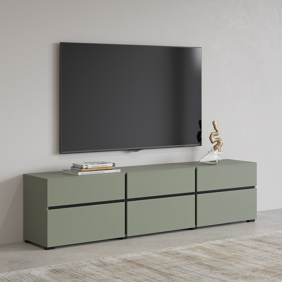 Apportez une touche contemporaine à votre salon avec le meuble TV HAVANA. Avec ses dimensions de 180 cm de largeur, 48 cm de hauteur et 40 cm de profondeur, ce meuble est équipé de 3 portes abattantes et de 3 tiroirs, offrant un espace de rangement optimal. Le coloris vert sauge associé au noir mat crée une esthétique moderne et chaleureuse, idéale pour tout salon contemporain.