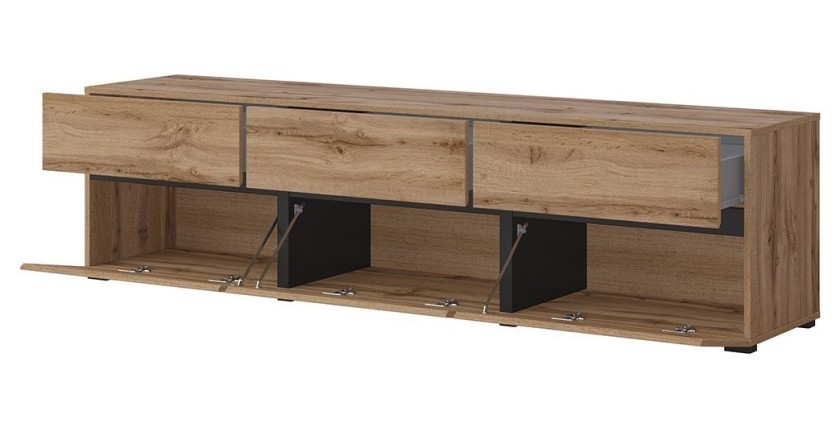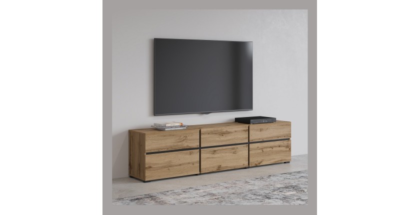 Ajoutez une touche contemporaine à votre salon avec le meuble TV HAVANA. Avec ses dimensions de 180 cm de largeur, 48 cm de hauteur et 40 cm de profondeur, ce meuble est équipé de 3 portes abattantes et de 3 tiroirs, offrant un espace de rangement optimal. Le coloris chêne associé au noir mat crée une esthétique moderne et chaleureuse, idéale pour tout espace de vie.