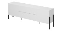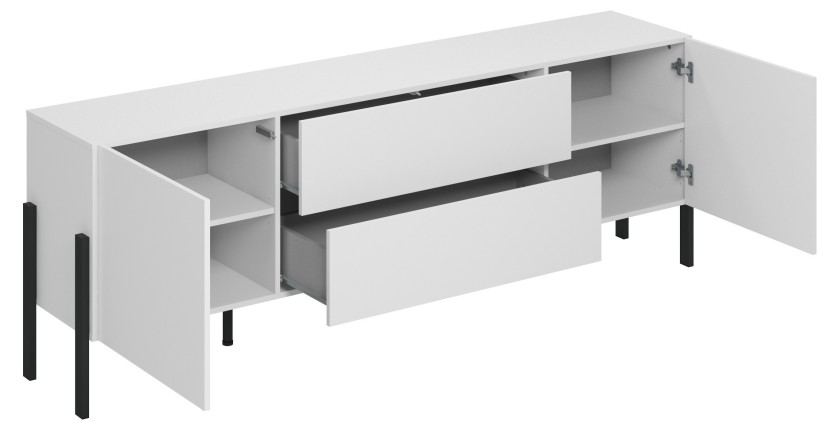 Offrez à votre salon une touche résolument moderne avec ce meuble TV SALMA en finition deep matte blanc super matt et accents noir mat. Épuré et fonctionnel, il dispose de 2 portes et 2 tiroirs à système Push-to-Open, le tout soutenu par des pieds en métal pour une parfaite stabilité. Chaque coloris apporte un caractère unique, s’adaptant à tous les styles de décoration.