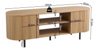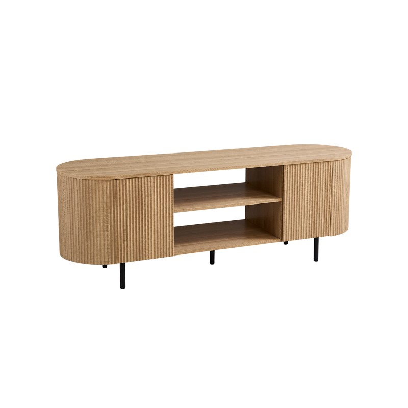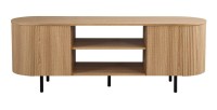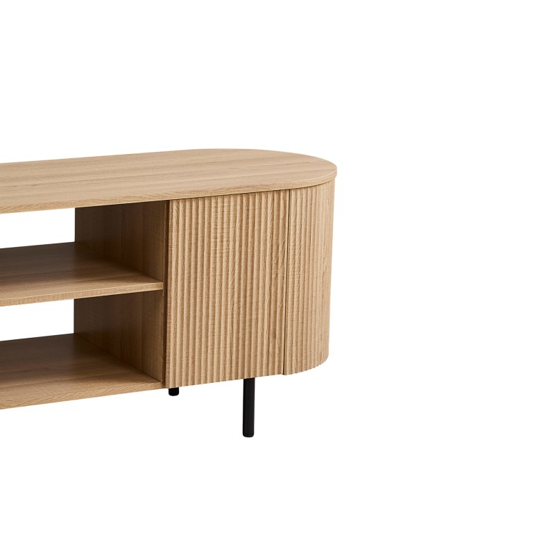 Ce meuble TV arrondi au format L160 x H57,5 x P45 cm séduit par sa teinte lumineuse et ses volumes bien pensés. Le coloris chêne naturel crée une ambiance douce, chaleureuse et actuelle dans votre pièce de vie.