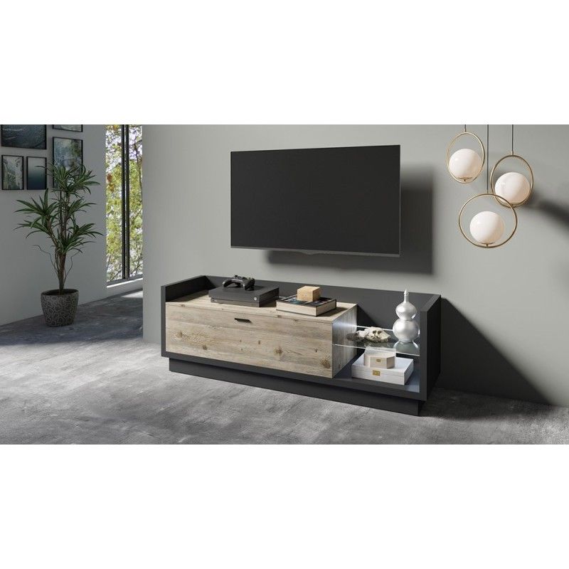 Le meuble TV CORK combine le style moderne avec une fonctionnalité exceptionnelle. Avec ses dimensions de 220 x 58 x 48 cm, il est conçu pour accueillir vos équipements audiovisuels tout en offrant un espace de rangement élégant. Le meuble est doté d'un grand tiroir pour un rangement pratique et d'étagères en verre illuminées par des LED, créant une ambiance sophistiquée dans votre salon. Le coloris gris anthracite associé à l'aspect pin apporte une touche de modernité et de chaleur à votre intérieur.