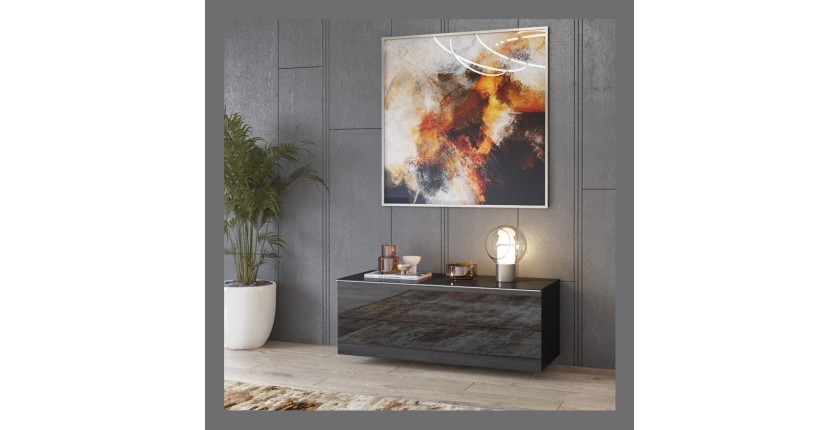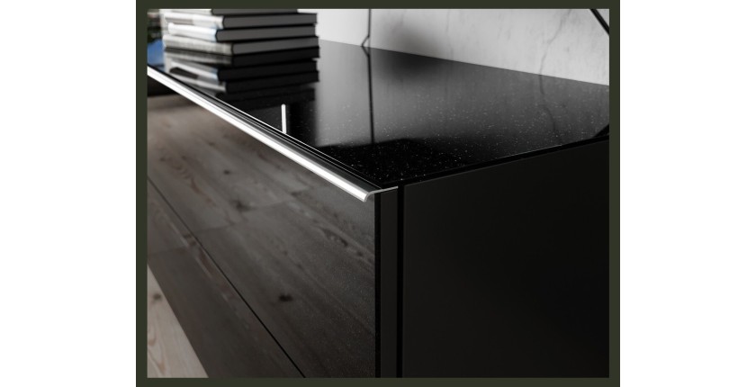 Le meuble TV design ZANTE sera du plus bel effet dans votre intérieur grâce à son design et ses finitions noires brillantes pailletées. Possibilité de poser ou suspendre le meuble.