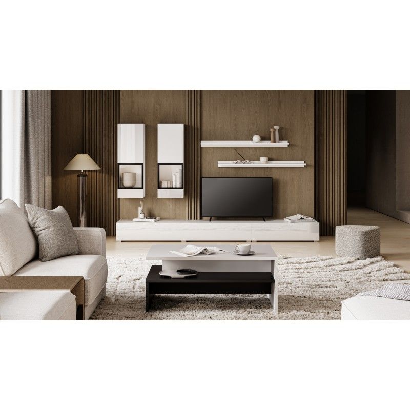La composition se compose de 2 blocs TV abattants, 2 vitrines murales vitrées et 2 étagères murales. Le corps des meubles est réalisé en blanc mat, tandis que les façades brillent avec un blanc laqué accentué par des contours noirs sur les vitrines. Ce jeu de contrastes crée une profondeur visuelle sophistiquée.