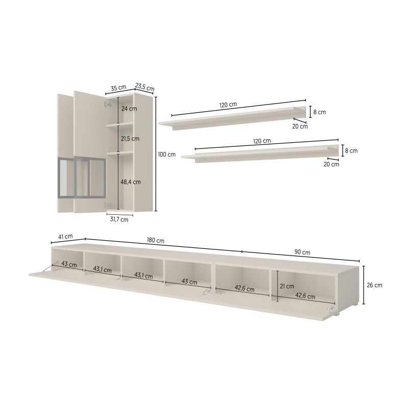 | Dimensions des éléments (en cm) | Meuble TV L270 x H26 x P41 cm, vitrines L35 x H100 x P25 cm, étagères L120 x H8 x P20 cm. |