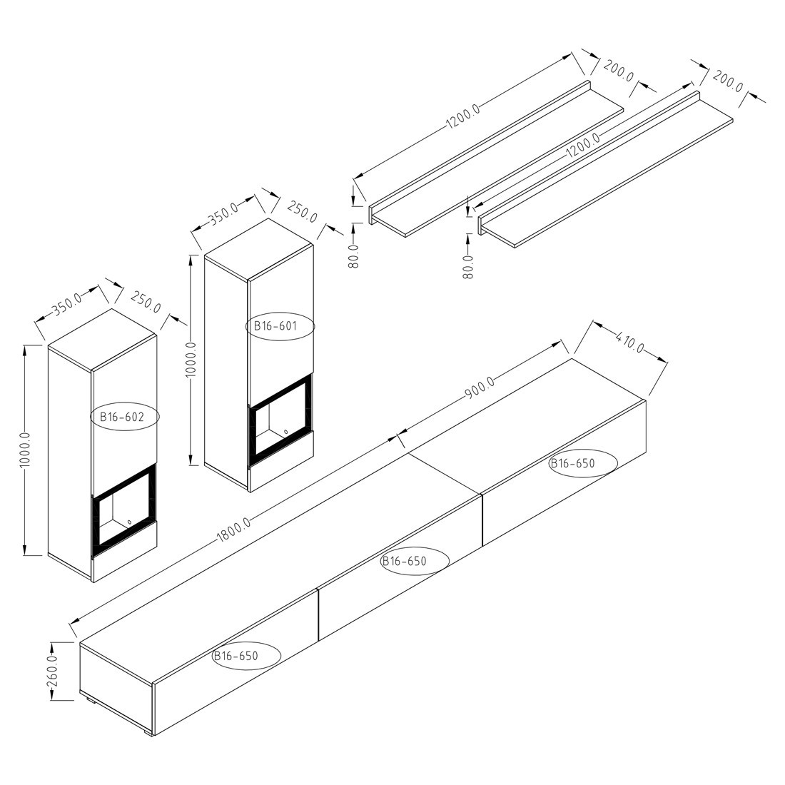 | Contenu du pack | deux meubles TV, deux vitrines suspendues, deux étagères |
