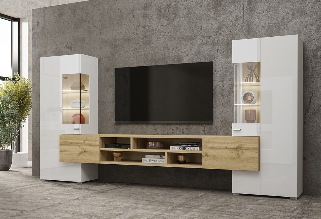 Composée d’un meuble TV suspendu et de deux vitrines à poser, cette composition offre un parfait équilibre entre esthétique et fonctionnalité, tout en optimisant vos espaces de rangement.