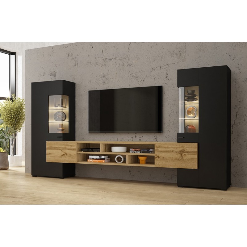 Composée d’un meuble TV suspendu et de deux vitrines à poser, cette composition offre un parfait équilibre entre esthétique et fonctionnalité, tout en optimisant votre rangement.