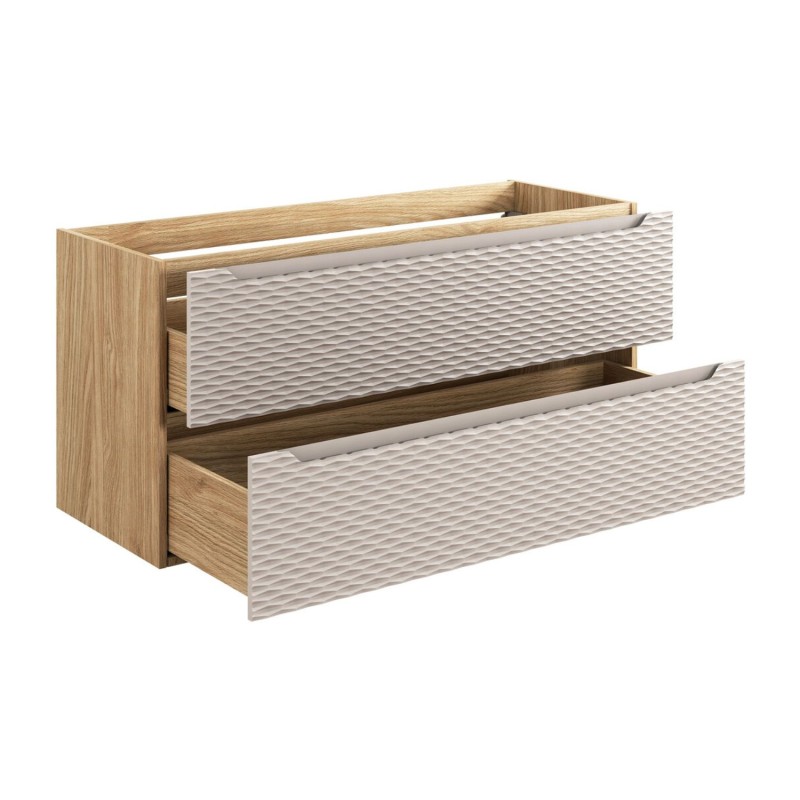 Le meuble sous vasque YOKA 120 cm associe le charme du chêne clair à la douceur du beige mat pour un rendu naturel et chaleureux. Idéal pour les salles de bain contemporaines, il offre un équilibre parfait entre design et praticité.