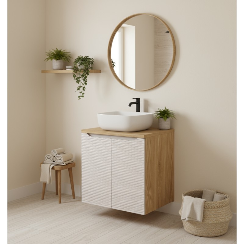 Fabriqué en MDF et panneaux mélaminés de qualité, ce meuble séduit par sa robustesse et sa finition mate. Sa structure suspendue met en valeur la légèreté du meuble tout en facilitant le nettoyage du sol. Idéal pour les petites salles de bain, il combine parfaitement esthétisme et fonctionnalité. Vasque non incluse, plan vasque non inclus.