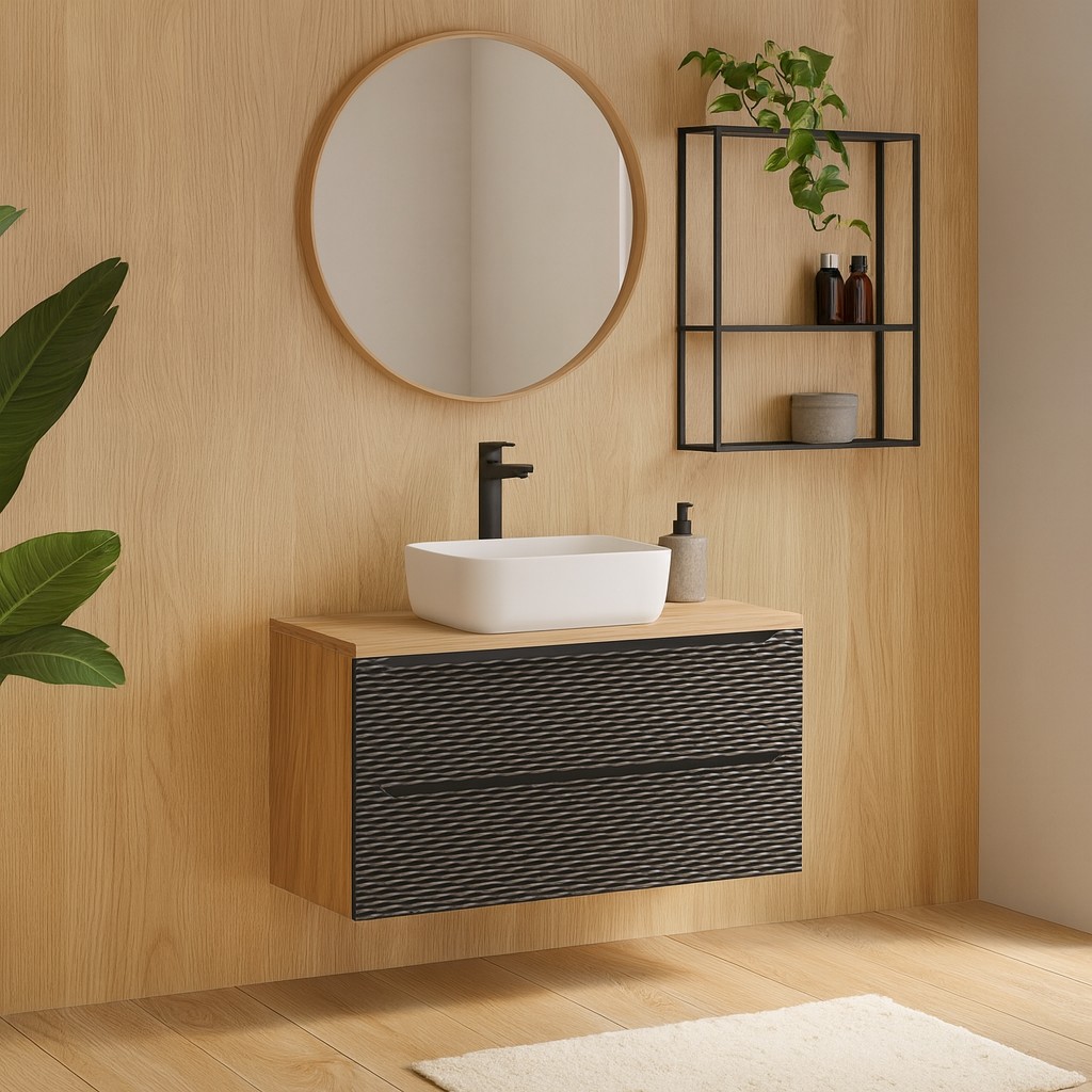 Fabriqué en panneaux de particules et MDF de première qualité, ce meuble assure une excellente résistance à l’humidité et une durabilité optimale. Les deux tiroirs spacieux permettent d’organiser parfaitement vos produits du quotidien, tout en conservant une ligne visuelle épurée.
