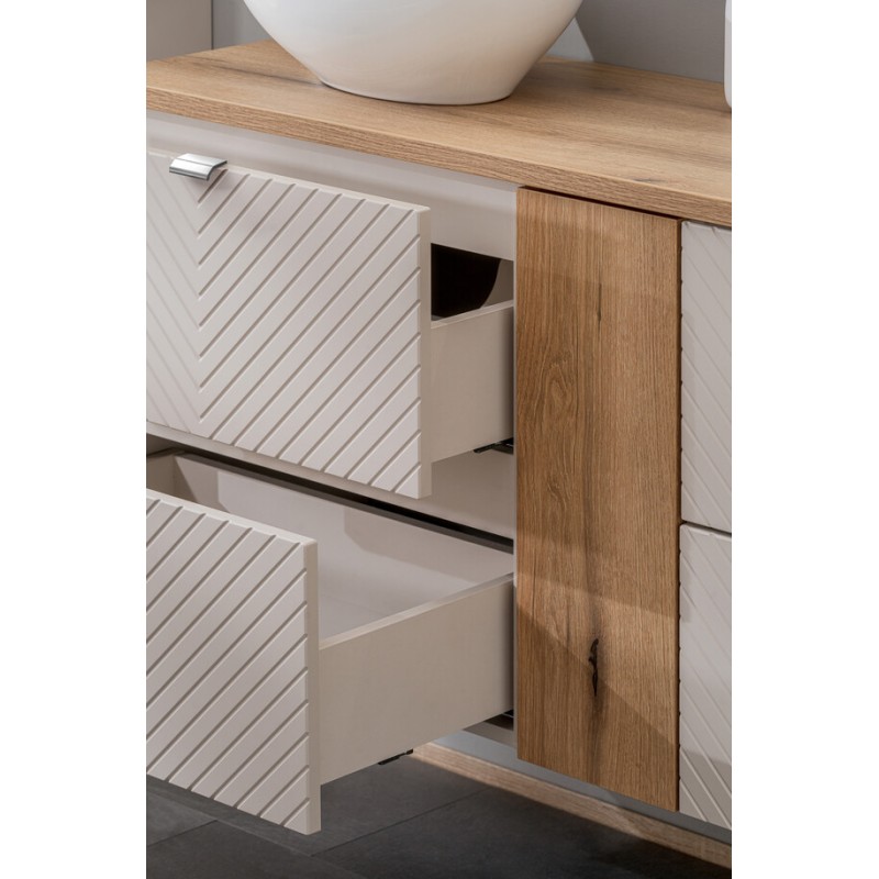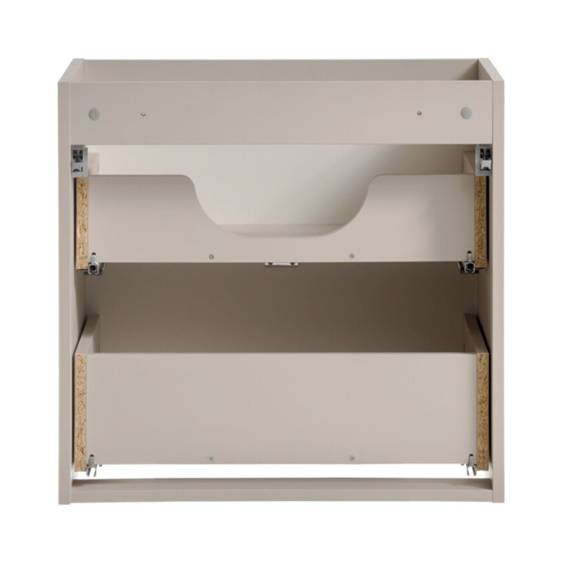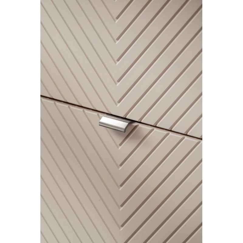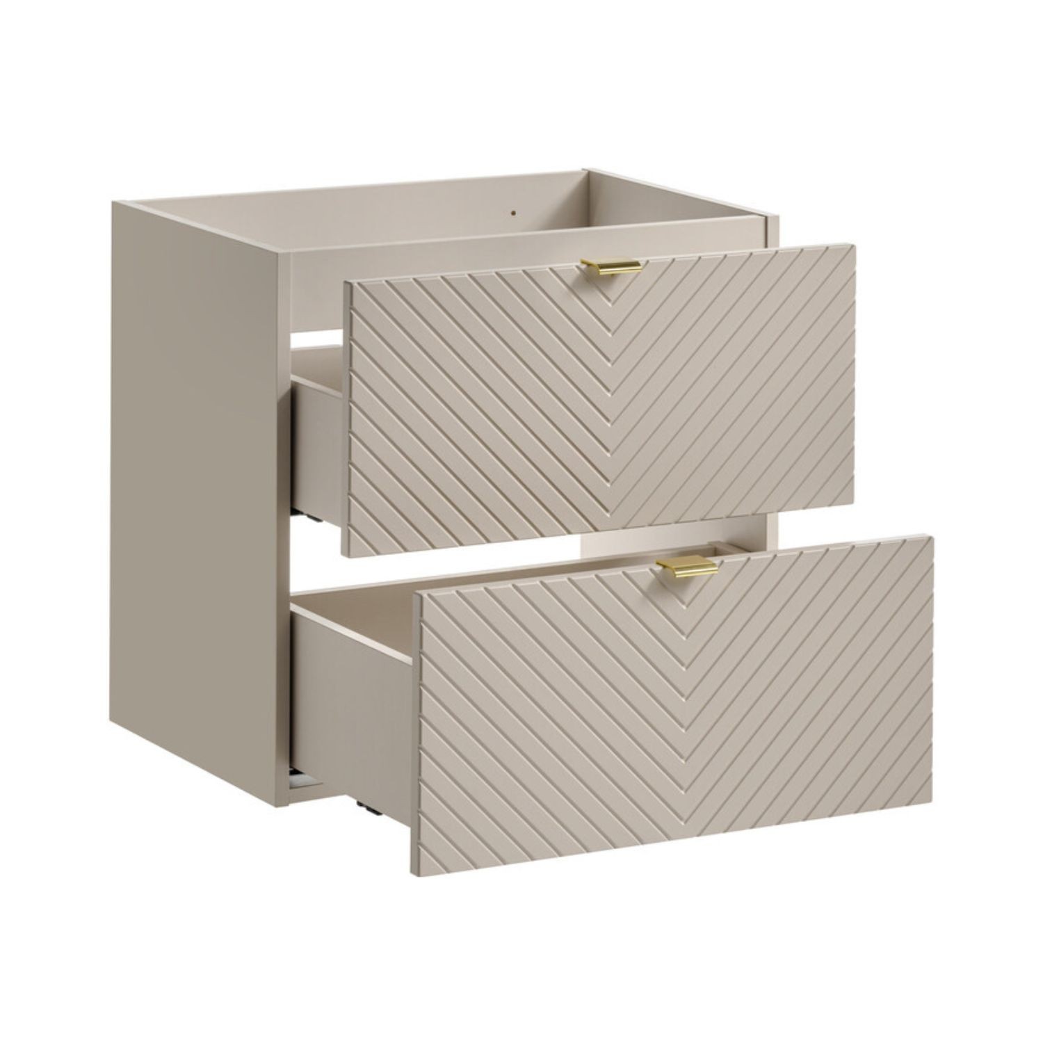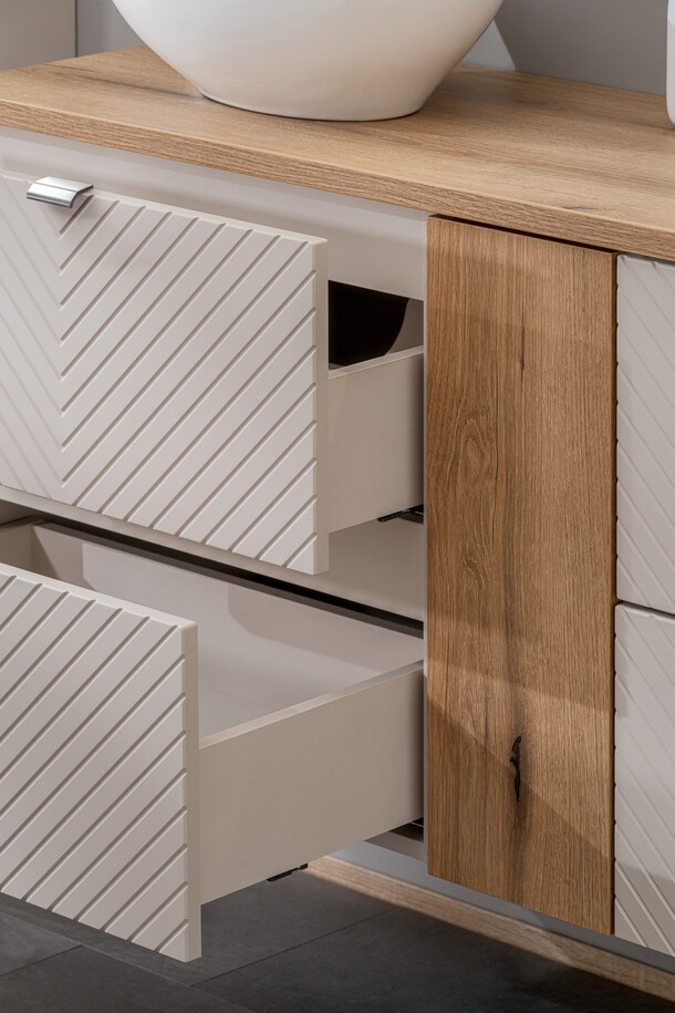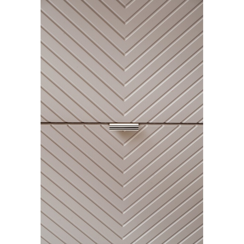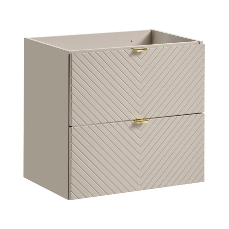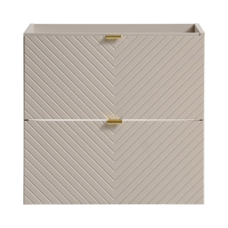 Alliant élégance japandi et fonctionnalité contemporaine, le meuble sous vasque AOKI est une pièce phare de la collection. Sa teinte beige cachemire mat et ses motifs en chevron délicatement texturés créent une ambiance apaisante et raffinée, typique des intérieurs zen modernes.