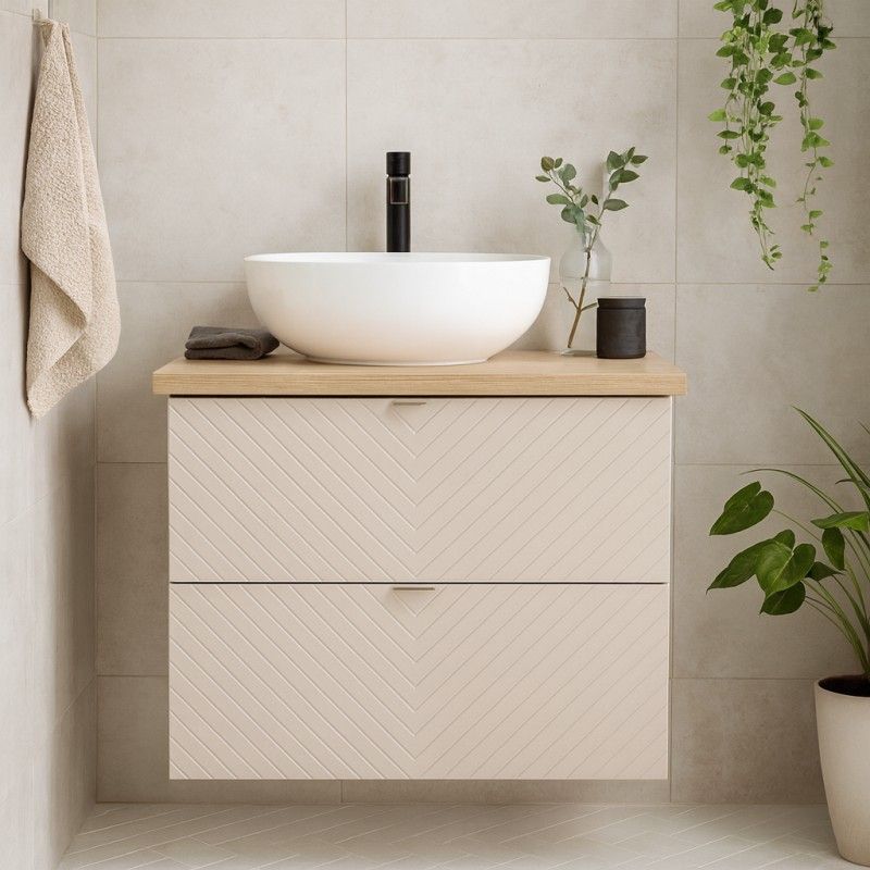 Apportez chaleur et modernité à votre salle de bain grâce à cet ensemble AOKI 80 cm, composé d’un meuble sous vasque à tiroirs et d’un plan vasque aspect bois. Son coloris cachemire mat associé à la texture bois clair crée une ambiance japandi raffinée et apaisante.