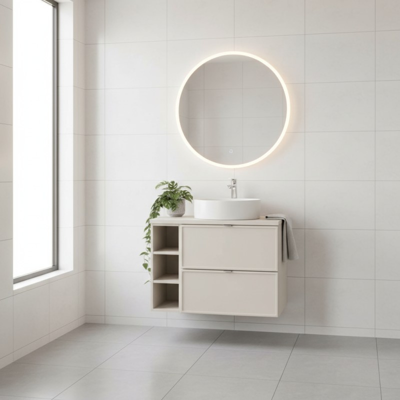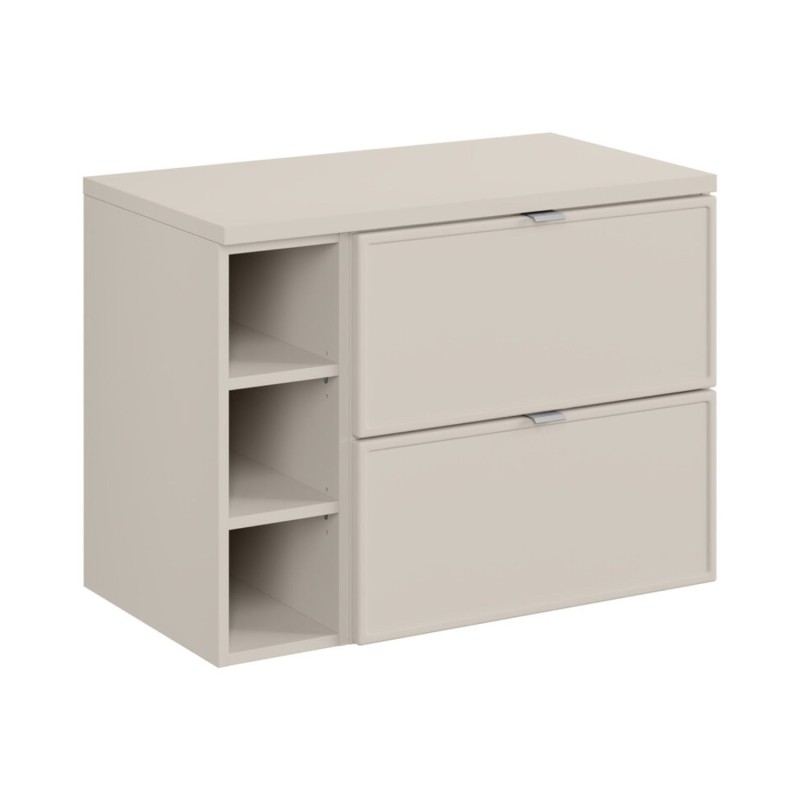 Optimisez votre espace avec cet ensemble BRAZZA 80 cm alliant fonctionnalité et modernité. Il se compose d’un meuble sous vasque à tiroirs en coloris cachemire mat, d’un module avec 3 niches visibles et d’un plan pour vasque assorti pour un rendu harmonieux et structuré.